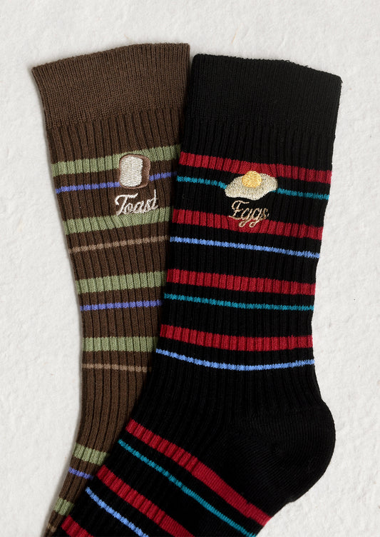 • A pair of brown socks with green stripe and 'toast' embroidery motif.