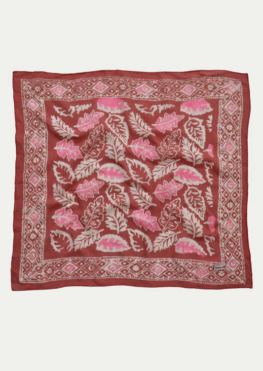 • A square cotton scarf in burgundy and ivory floral pattern.
