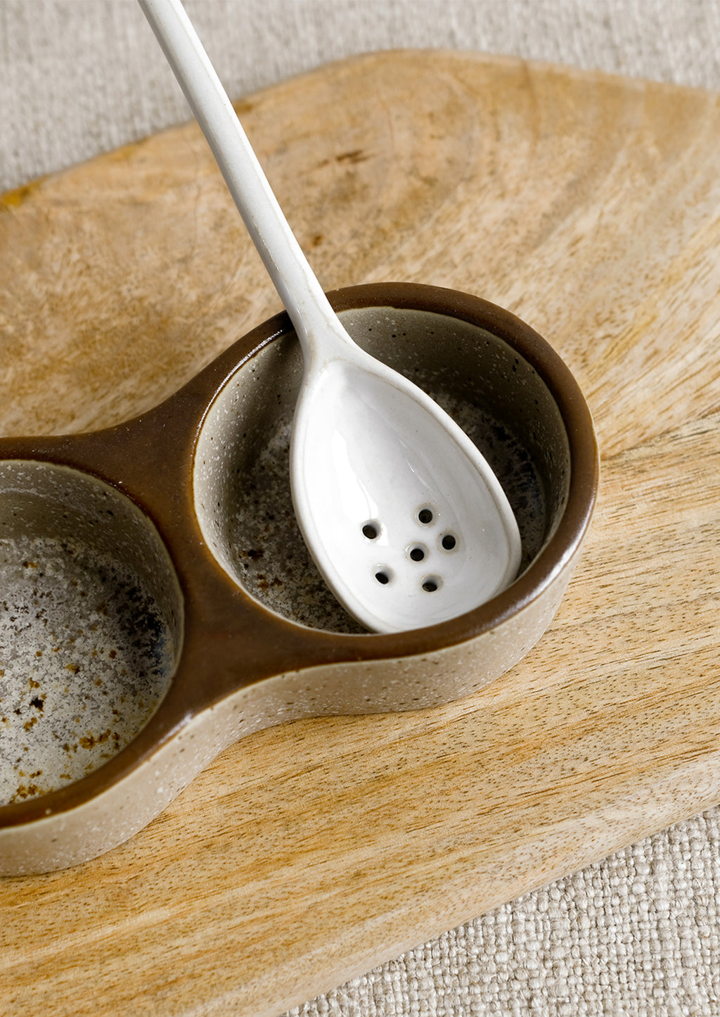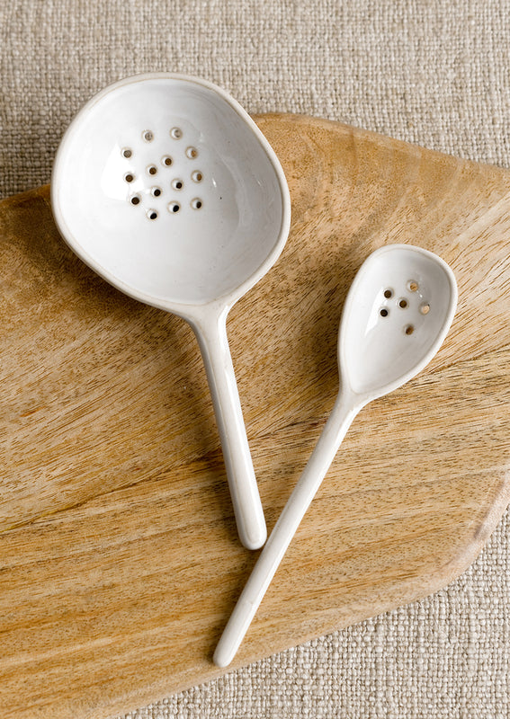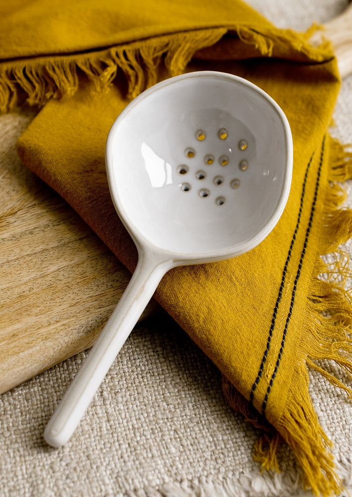 For straining everything from olives to pickles to eggs, this ceramic spoon is up for the task — in a slightly imperfect, askew shape it shows off a glossy, milky glaze.
