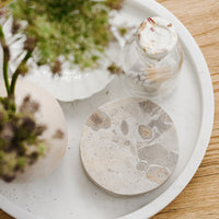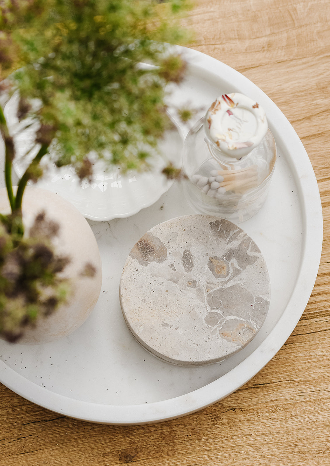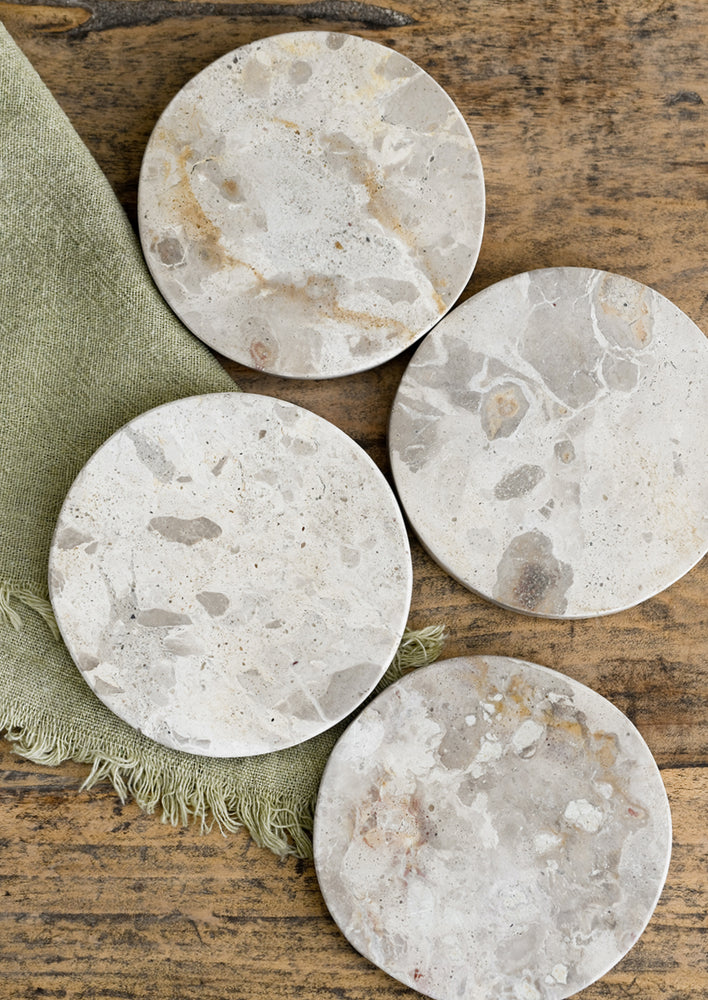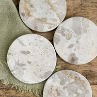 A landscape of earthy beige hues gives a grounded, natural feel to these round, stone coasters, sold as a set of four.