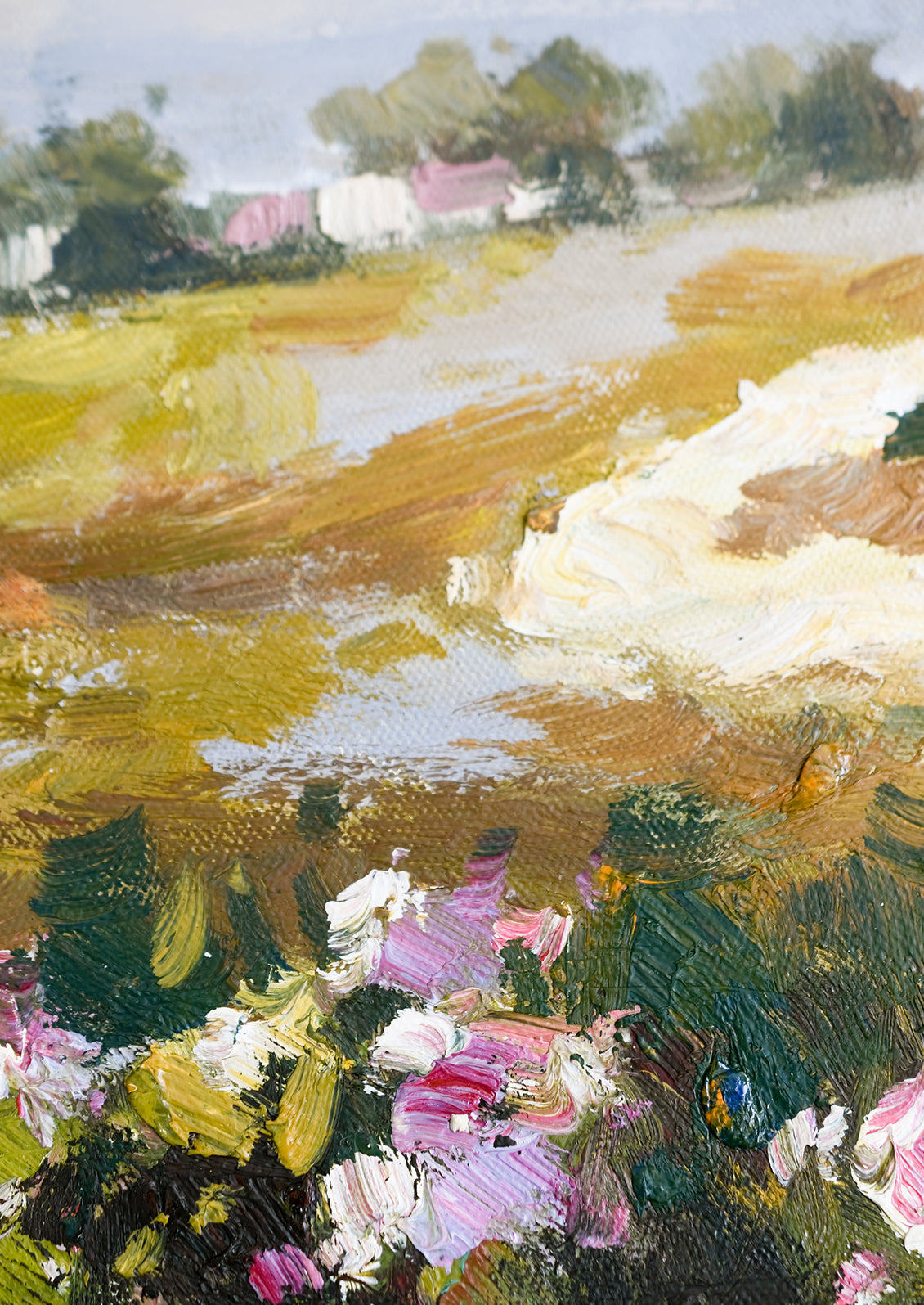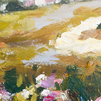 Painted in oil with thoughtful, thick brushstrokes and the perfect amount of texture, this original landscape painting shows off a rich and vibrant palette in a low-profile natural maple frame.