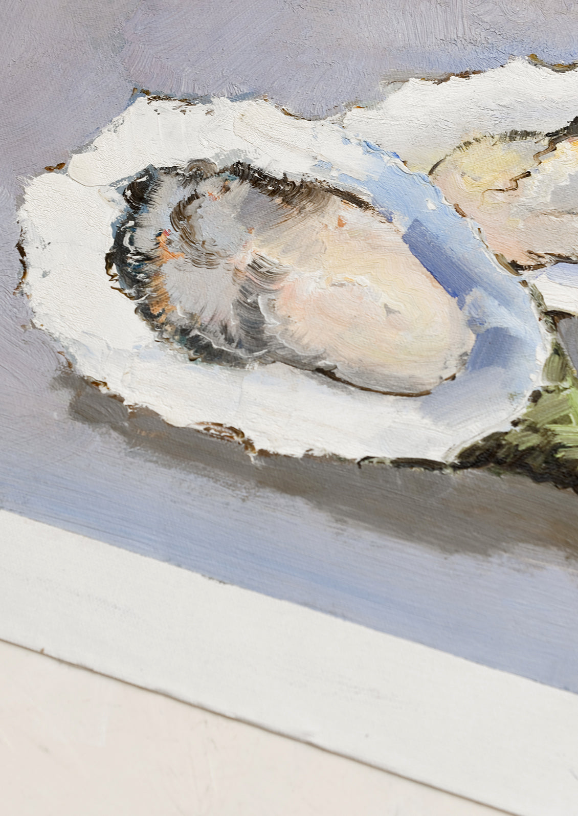 Painted on unstretched canvas, this original oil painting takes a colorful, coastal approach to still life. Thick, thoughtful brushstrokes, a controlled palette, and timeless imagery allow this painting to exude a certain kind of magic.