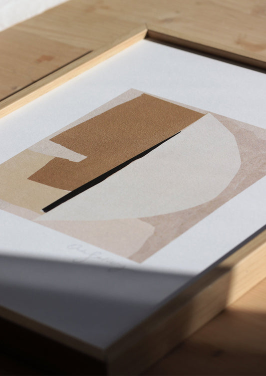 • An abstract watercolor art print with asymmetrical form in shades of ochre and pink.