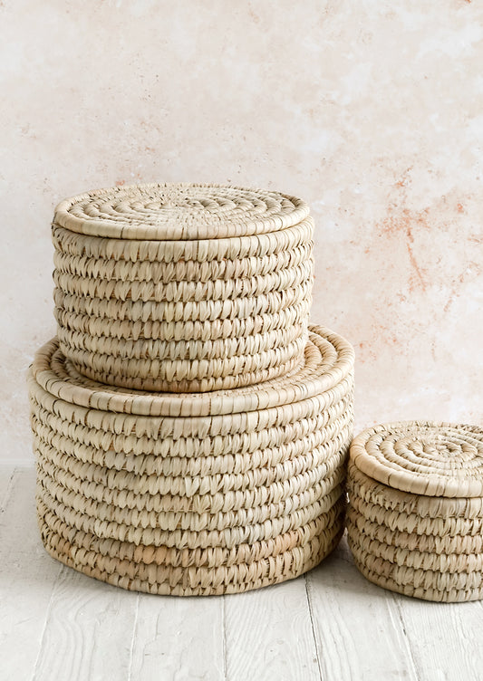 • Three round, palm leaf storage baskets with lids in incremental sizes.