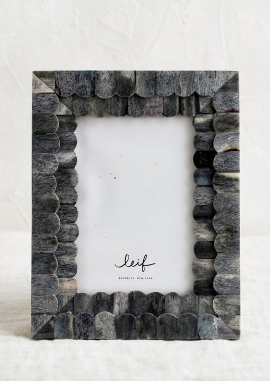 • A tabletop picture frame with scalloped ivory bone border.