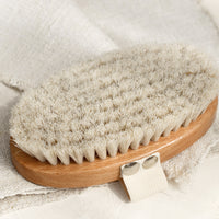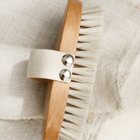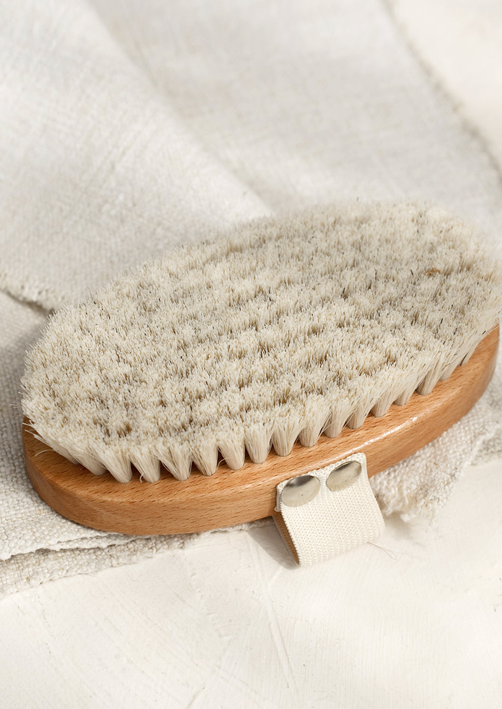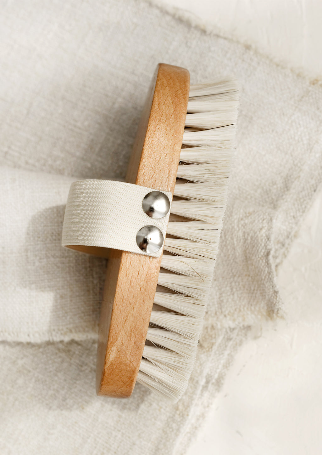 Equipped with a comfortable elastic band, this soft-bristled brush (crafted from natural beechwood) is a bath-time indulgence, perfect for gentle exfoliation.
