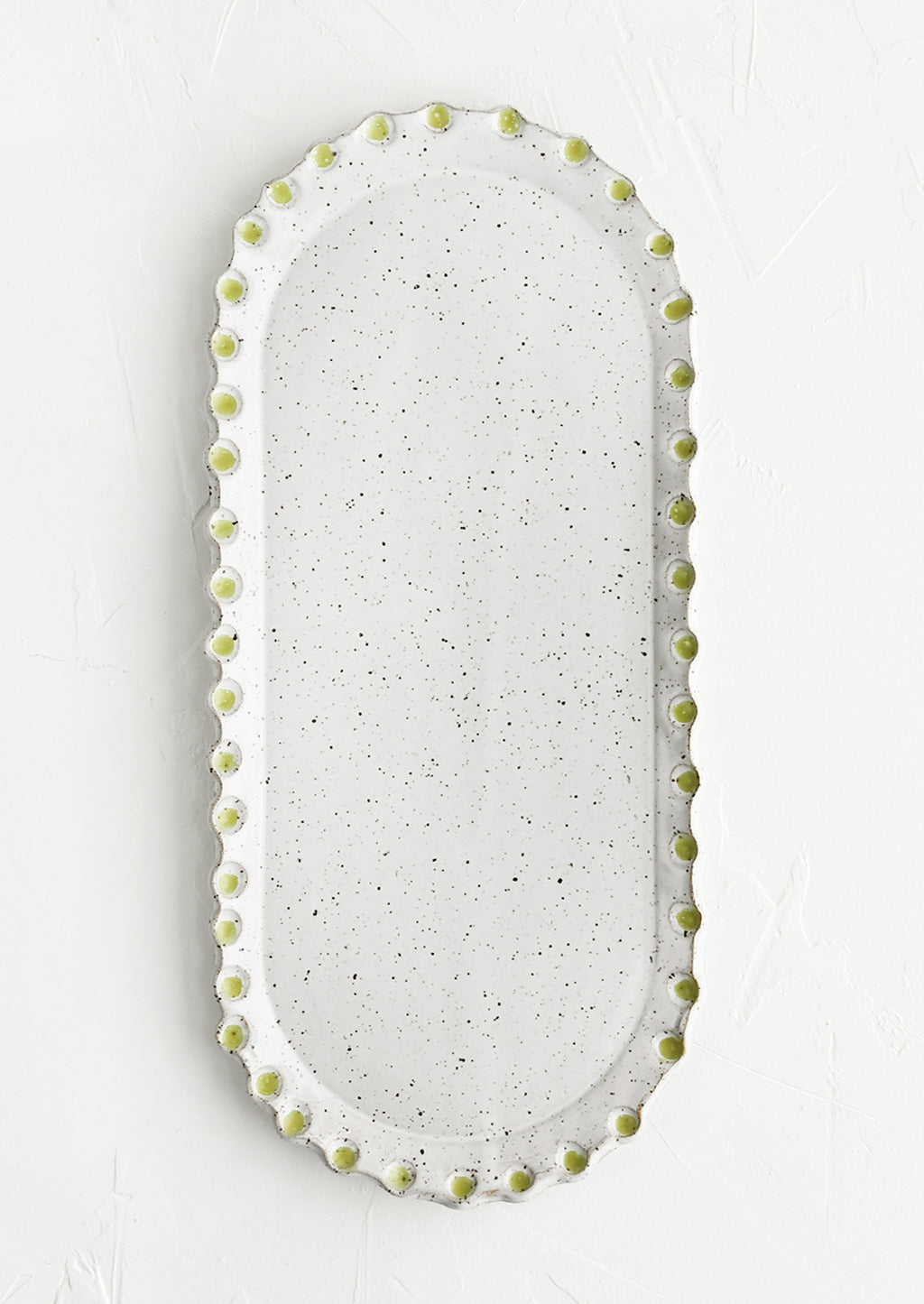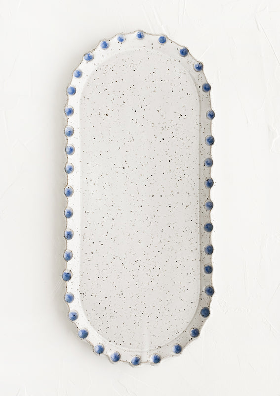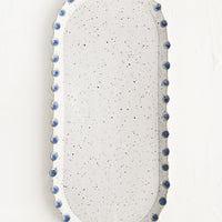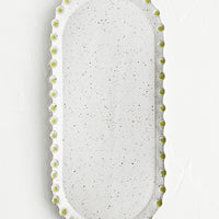 Individually made by hand by New York born-and-raised ceramicist Bari Moss, this oblong ceramic platter shows off an intricately detailed rim, exuding sophisticated playfulness.