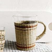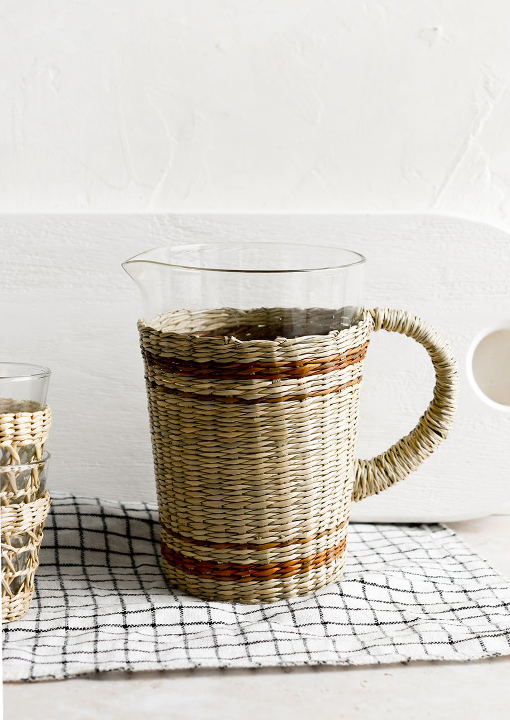 An essential companion for dining al fresco, this breezy glass pitcher is sheathed in sepia-striped seagrass for summery appeal.