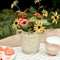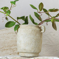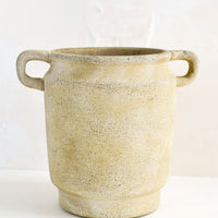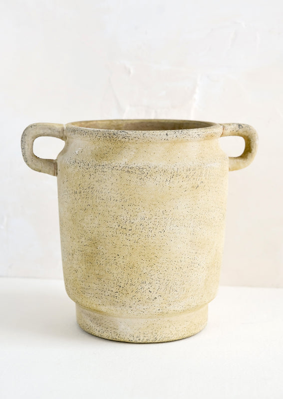 A naturally distressed patina gives an old world feel to this Grecian influenced vase, as beautiful with fresh blooms or greenery as it is on its own.