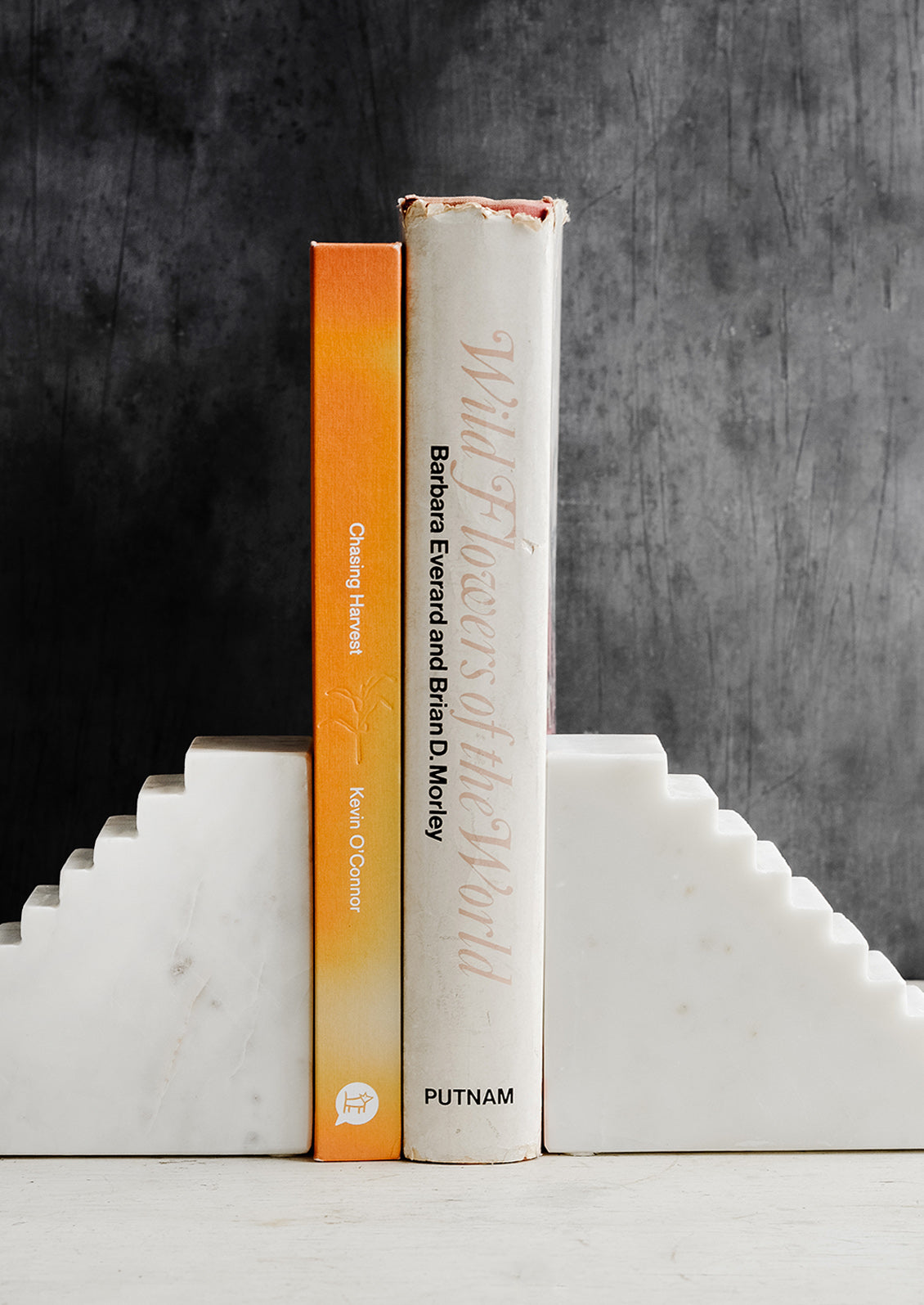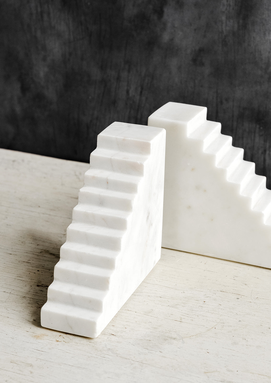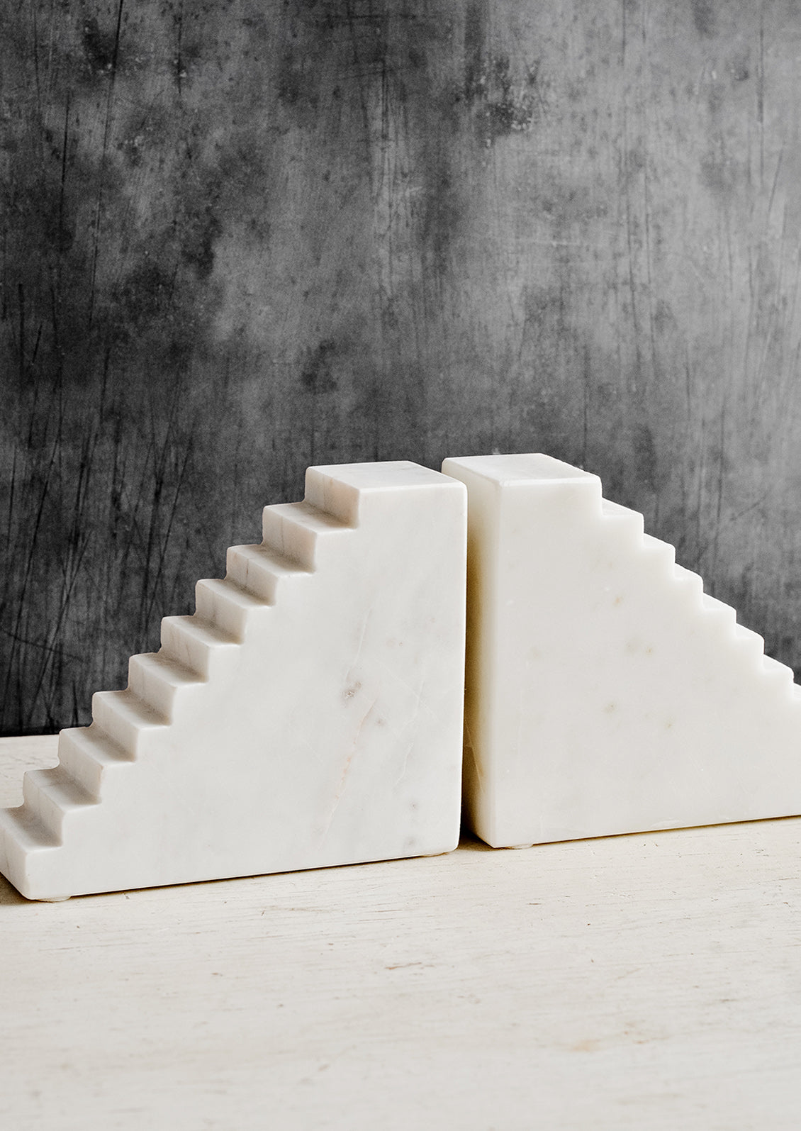 In solid marble, these weighty bookends (sold as a pair) stake their claim in an architectural inspired, staircase-like design.
