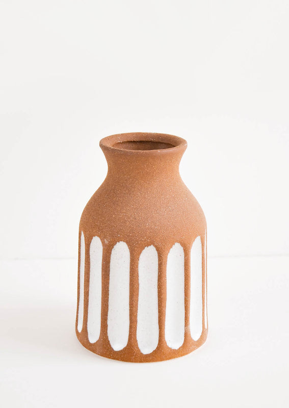 Decorated with stark white markings, this terracotta vase is rich with earthy texture. It stands on its own when decoratively displayed on a shelf, and equally shines when filled with blooming florals.