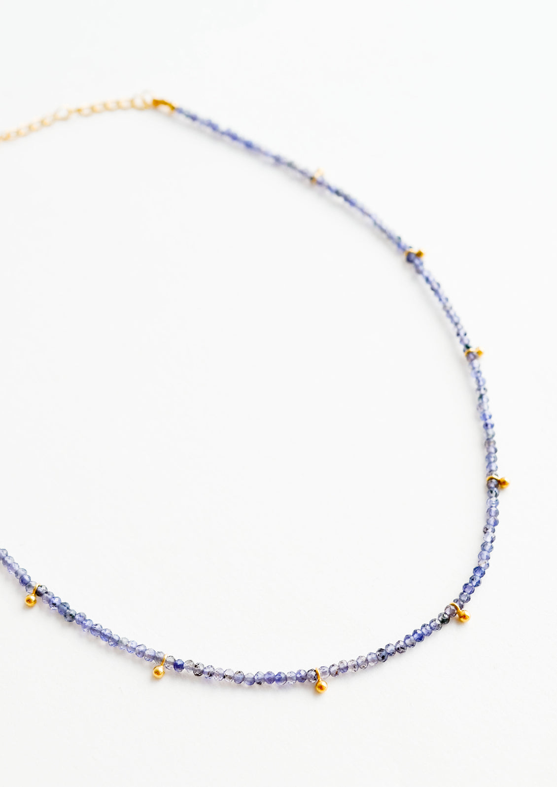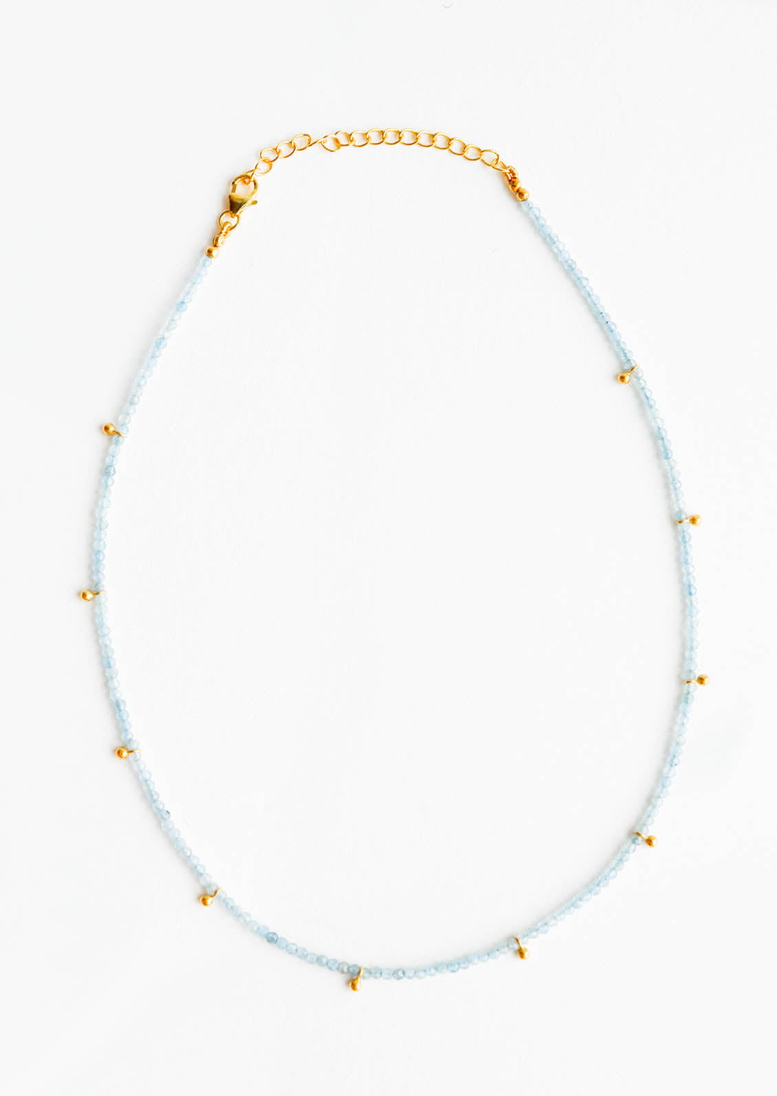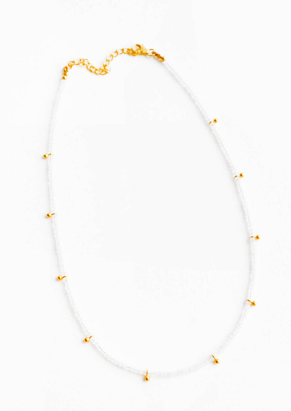Delicate, sparkling gemstone beads take on a pebbled, organic texture, giving off a soft glimmer in their wake. Sparse golden detailing lends a hint of glamour.