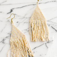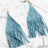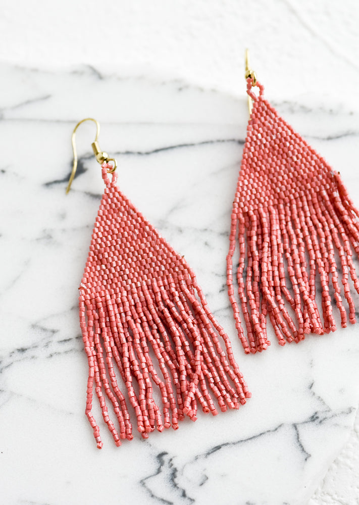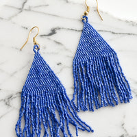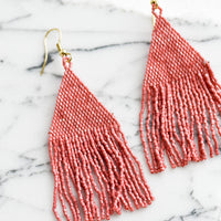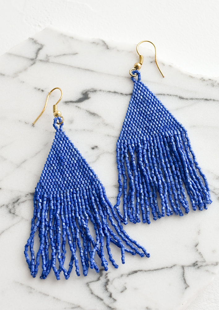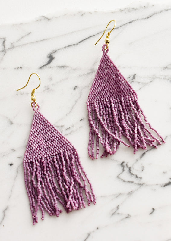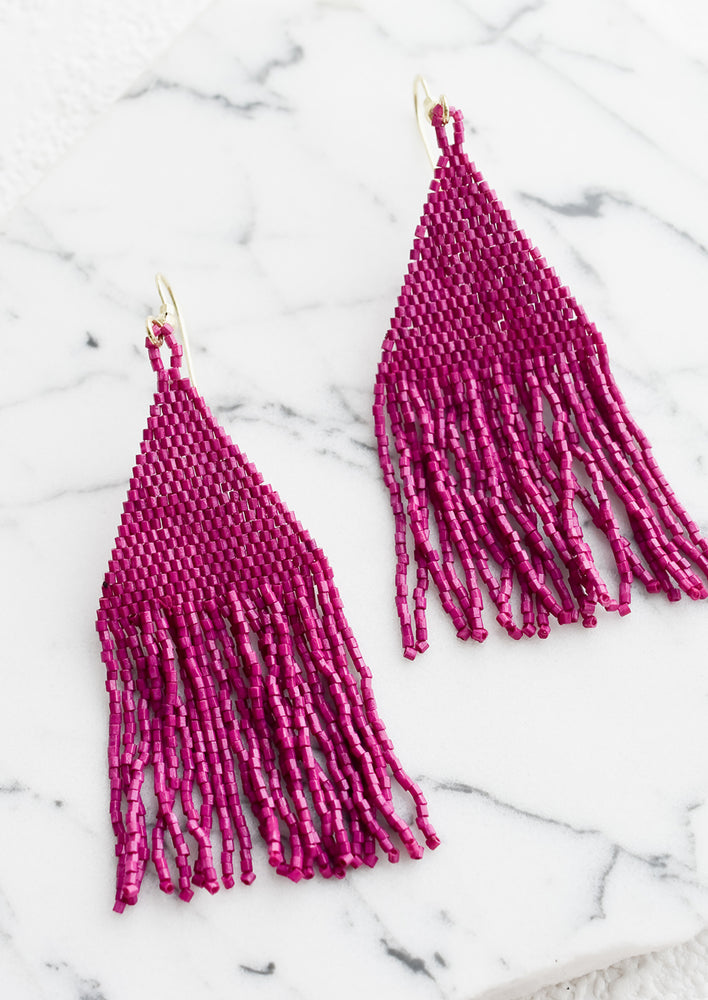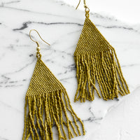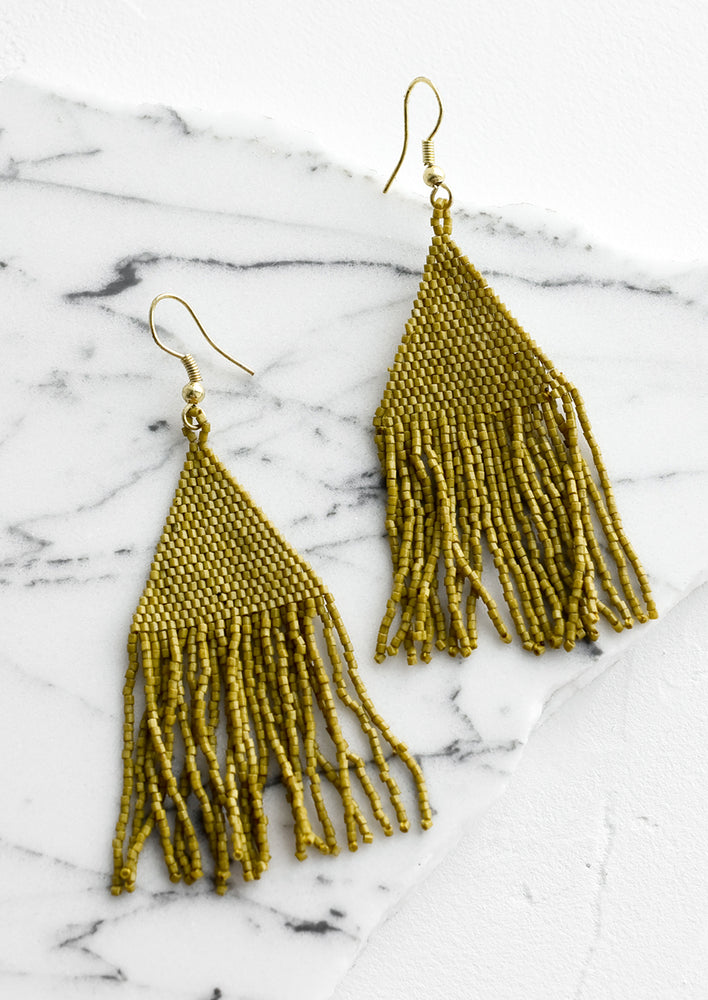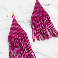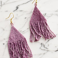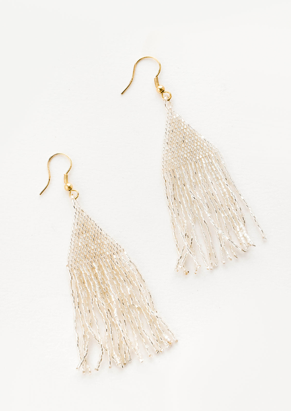 Glass seed beads with a subtle metallic finish give festive flair to these fringed earrings, showing off sparkling strands with every turn.