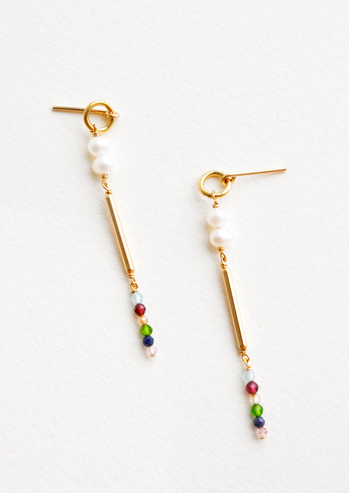 Tourmaline, sapphire, emerald, topaz, garnet and aquamarine gracefully align on these subtle earrings, topped with two freshwater pearls.