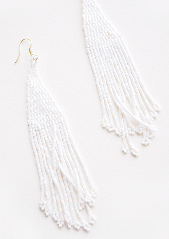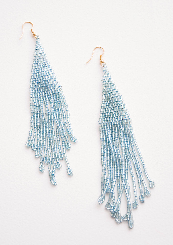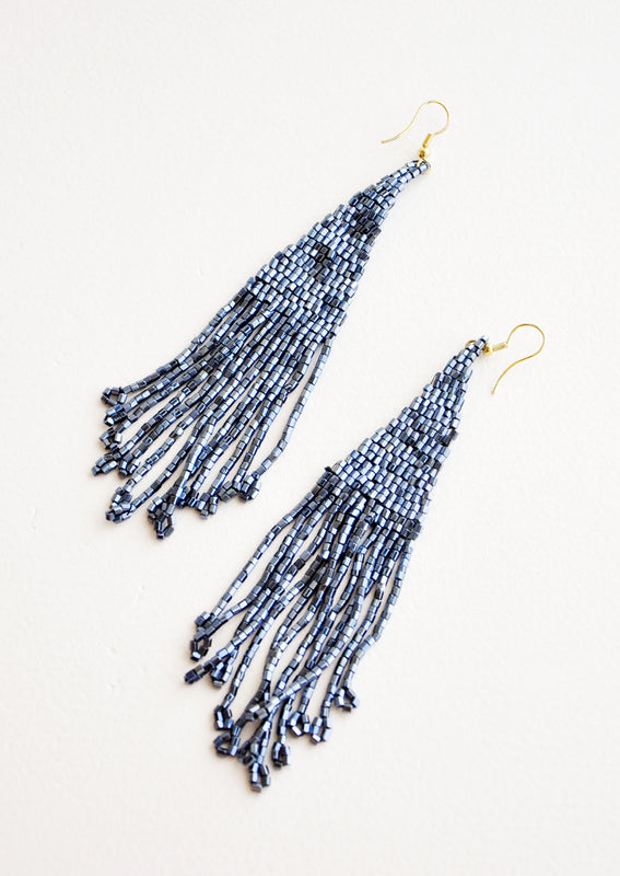 Disco ready, these shimmering statement earrings sparkle in metallic beads and a dramatic length.