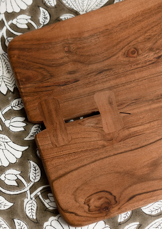 • A rectangular wooden cutting board with knot cutout detail and twine strap handle.