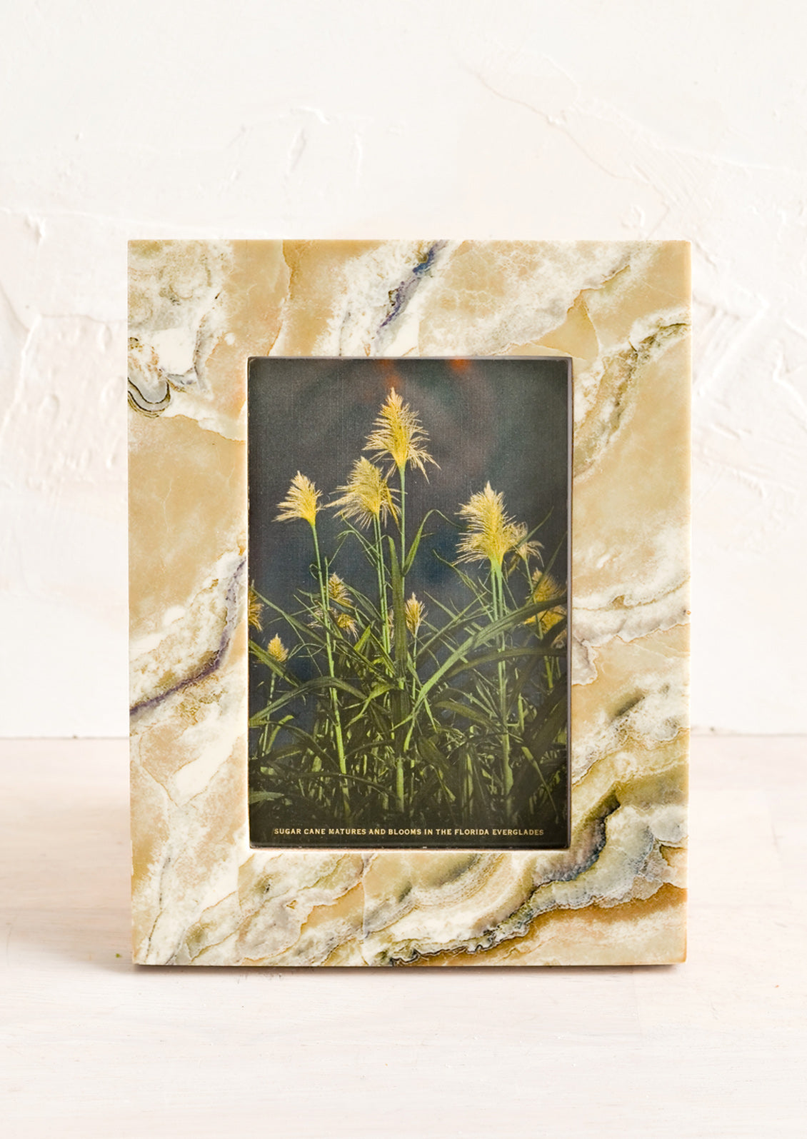 Creamy, marbled resin portrays on an onyx-like look on this timeless picture frame, equipped with an easel back for both horizontal and vertical photos.
