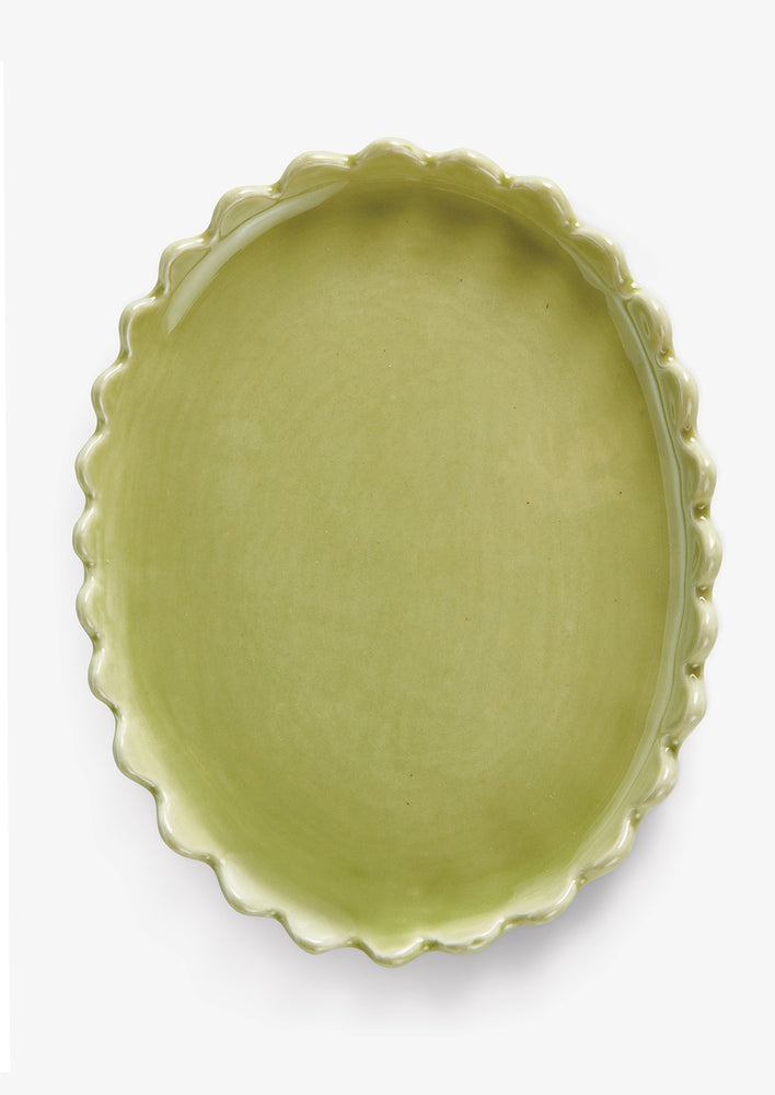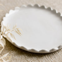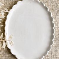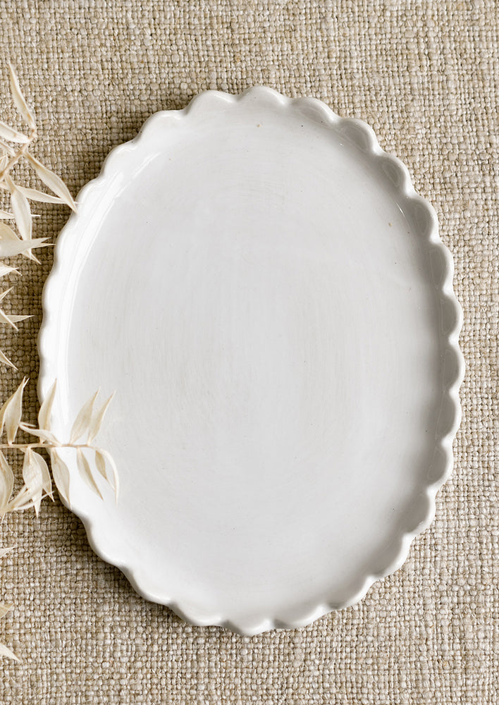 This petite-sized tray shows off sweet scalloped edges in a glossy white ceramic finish — use it as a catchall for perfumes on the dresser, or for biscuits or scones at tea time.