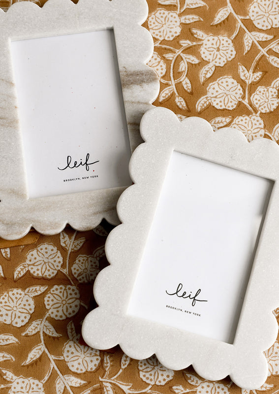 Showing off a sweet scalloped silhouette, this solid marble picture frame is a timeless treasure. Some will show tan variations in the marble, but most will not (each one is unique, and the one you receive may vary).