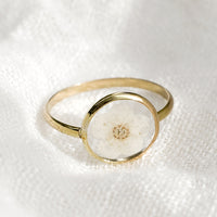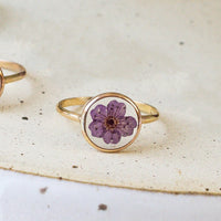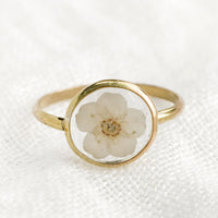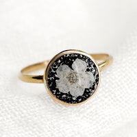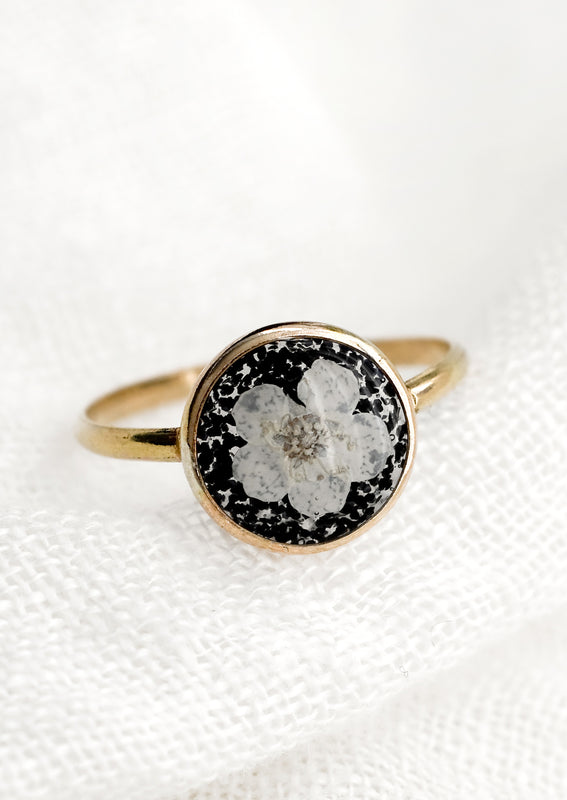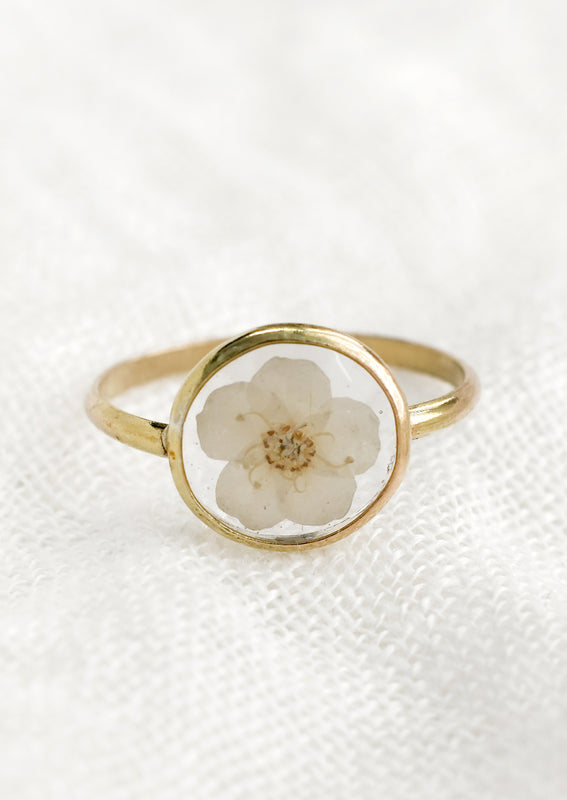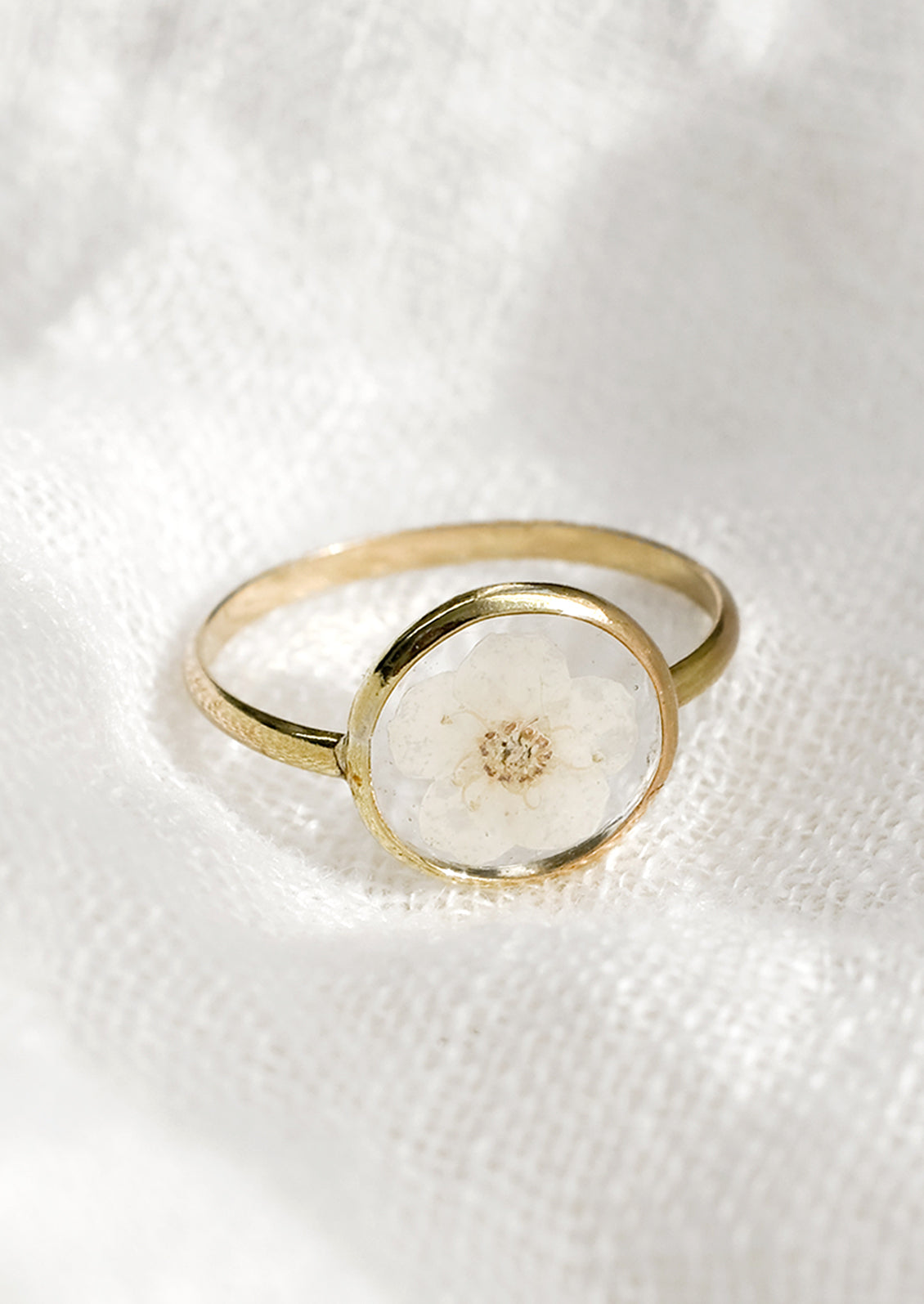 Framed in gold fill, the tiniest of (real!) flowers is framed in crystal clear resin on this botanical ring.