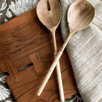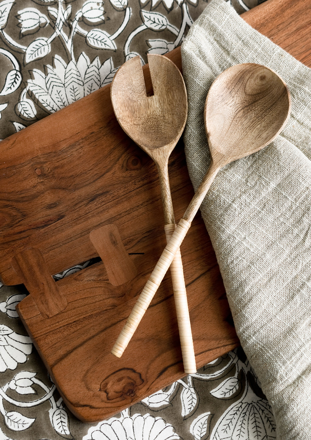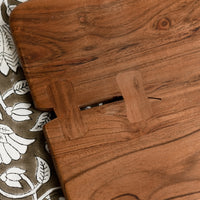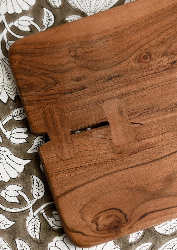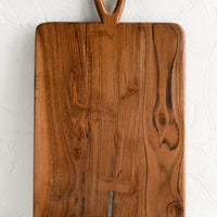 Acacia wood in a rich cherry stain gives a sophisticated look to this gorgeous cutting board, with a carved loop handle and bowtie inlay detailing for added character.