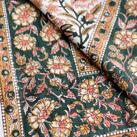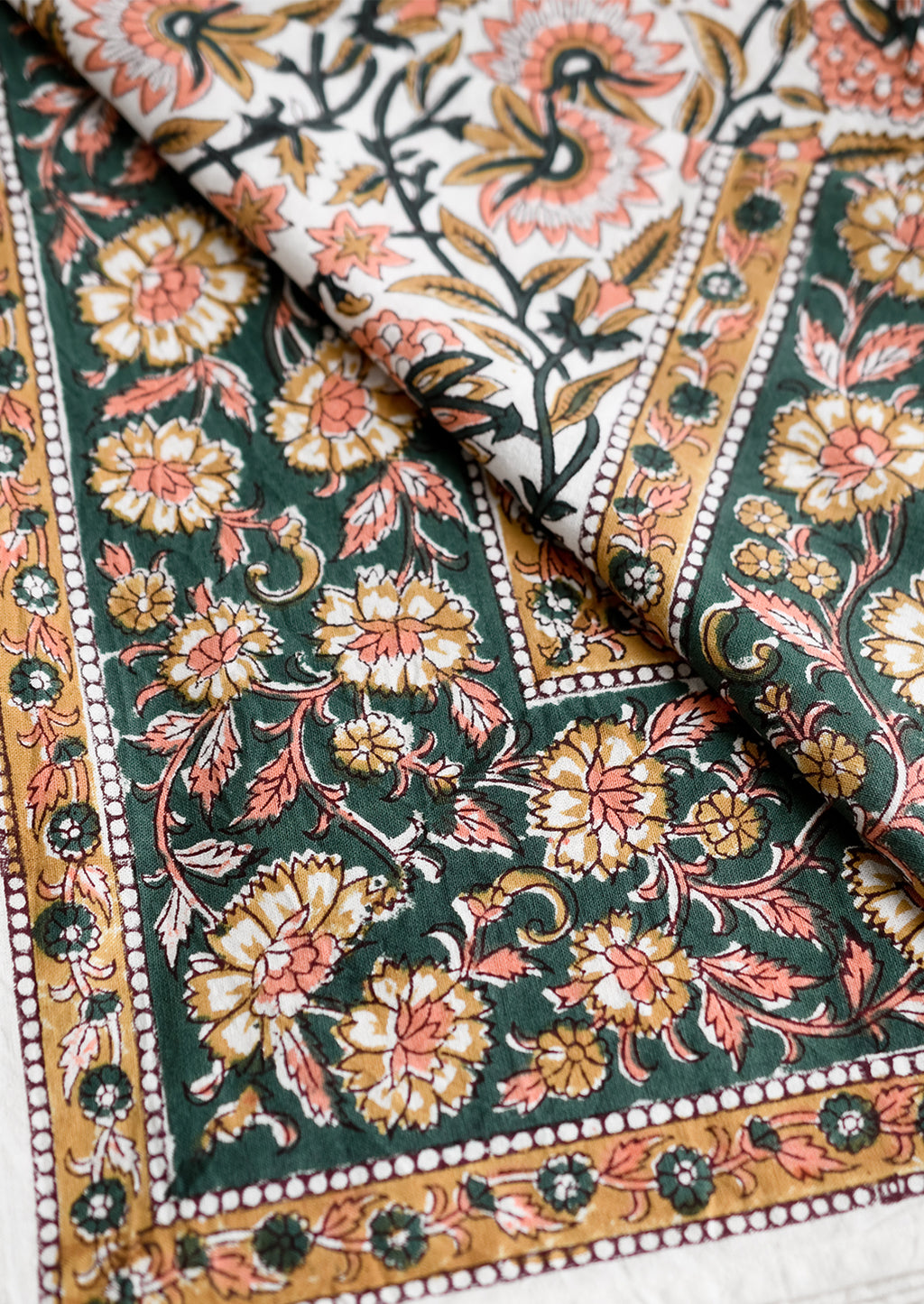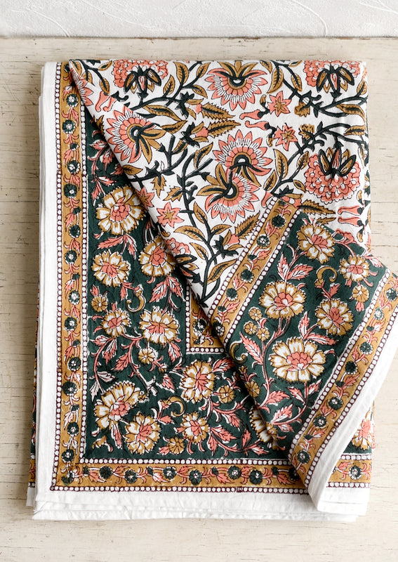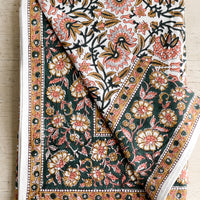 Hand printed by Indian artisans, this vibrant tablecloth marries traditional Indian design with modern appeal — a warm and inviting color palette comes to life in a bordered, floral pattern.
