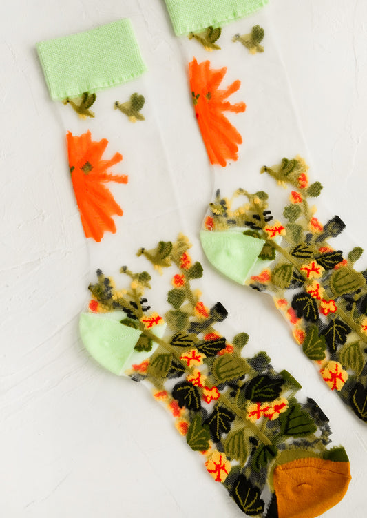 • A pair of white mesh socks with blue, yellow and green floral print.