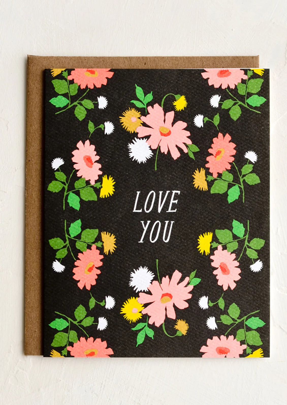 Vibrant flowers are set against a moody black background on this floral printed card sending a message of love. From Hartland Brooklyn.