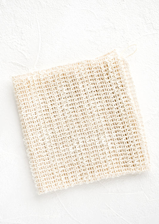 • Folded natural hemp fabric packaged as a wash mitt intended for use in bathing