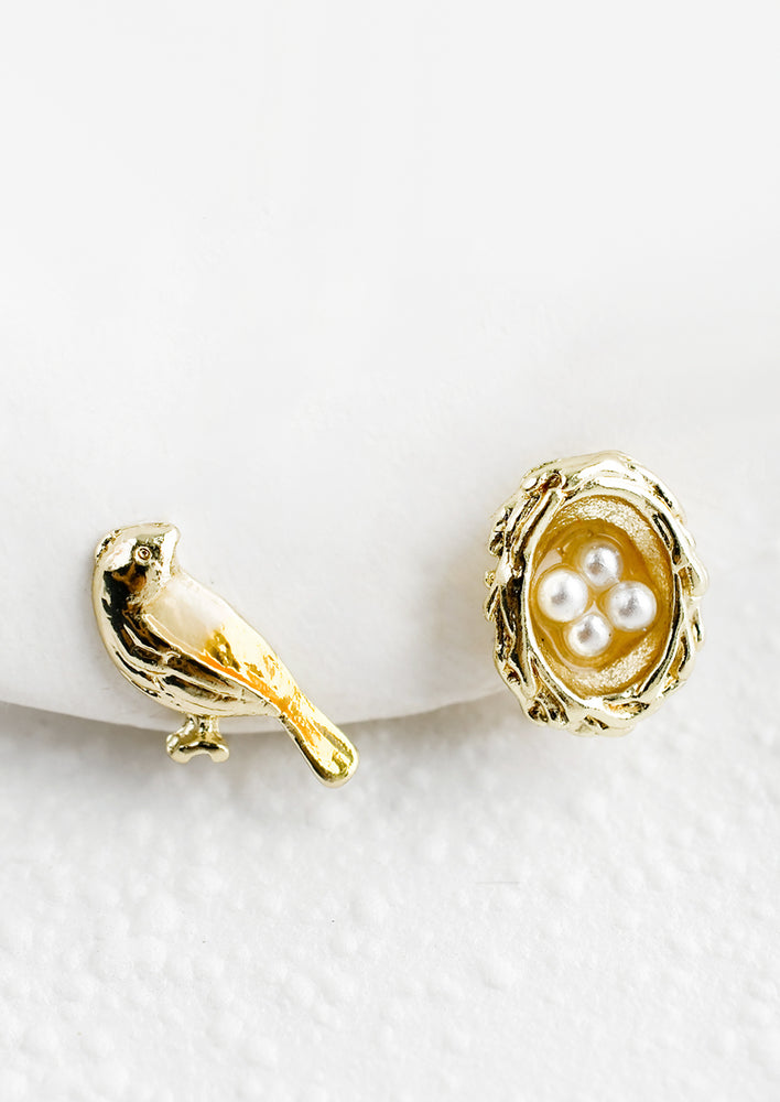 We're calling the trend now: mismatched earrings are on the rise. A winged finch is (mis)matched with a pearl egg-filled nest on this whimsical pair of studs.