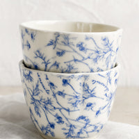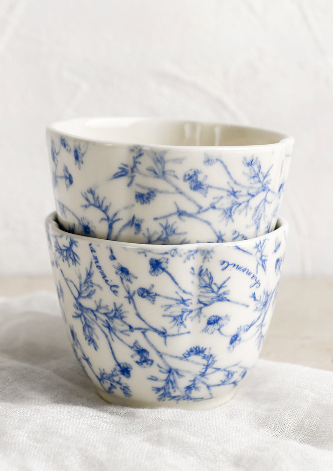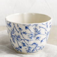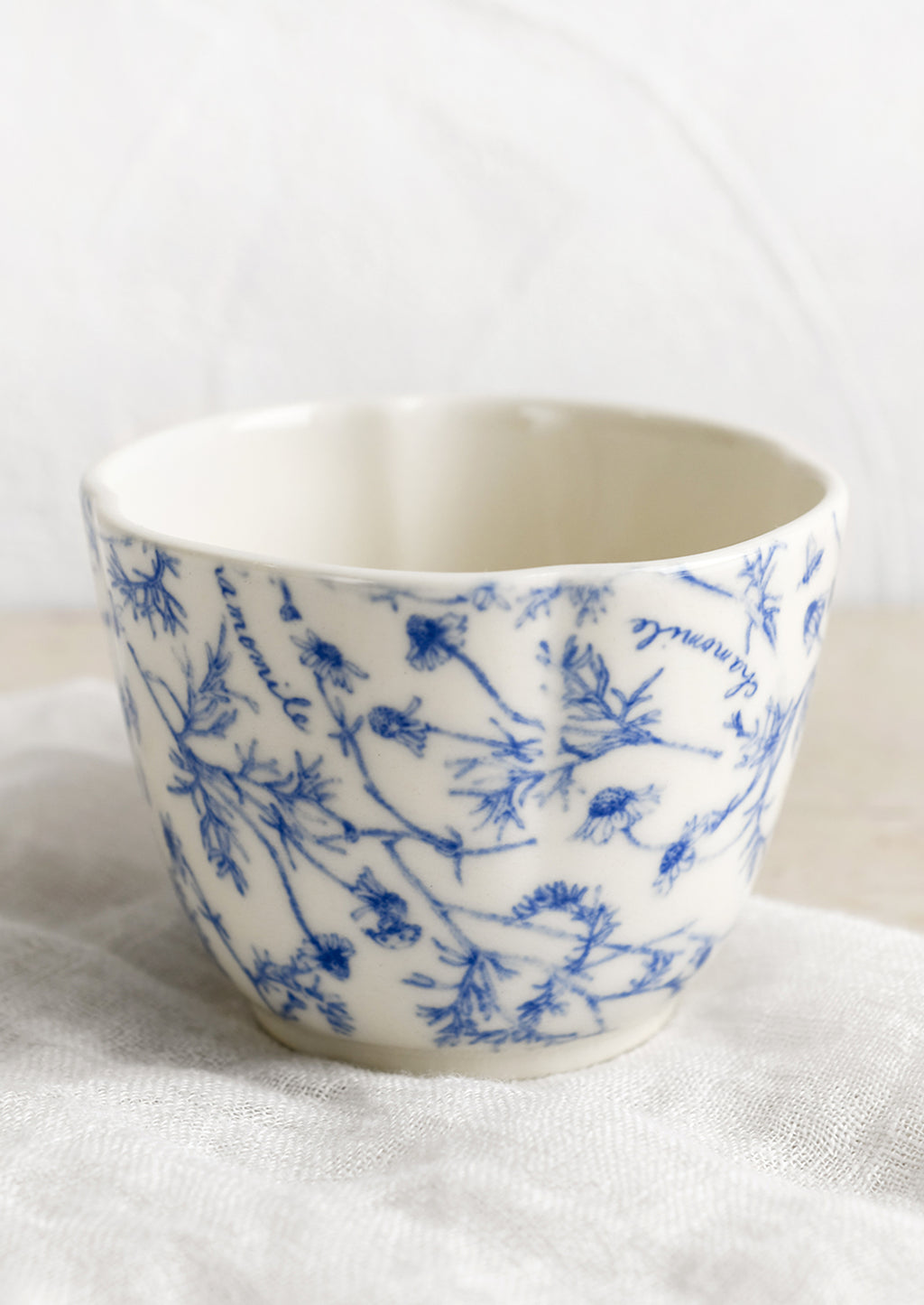 A sweet little vessel for tea or juice, this ceramic cup shows off a botanical, flowery chamomile pattern in classic blue and white.