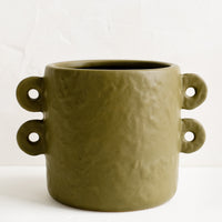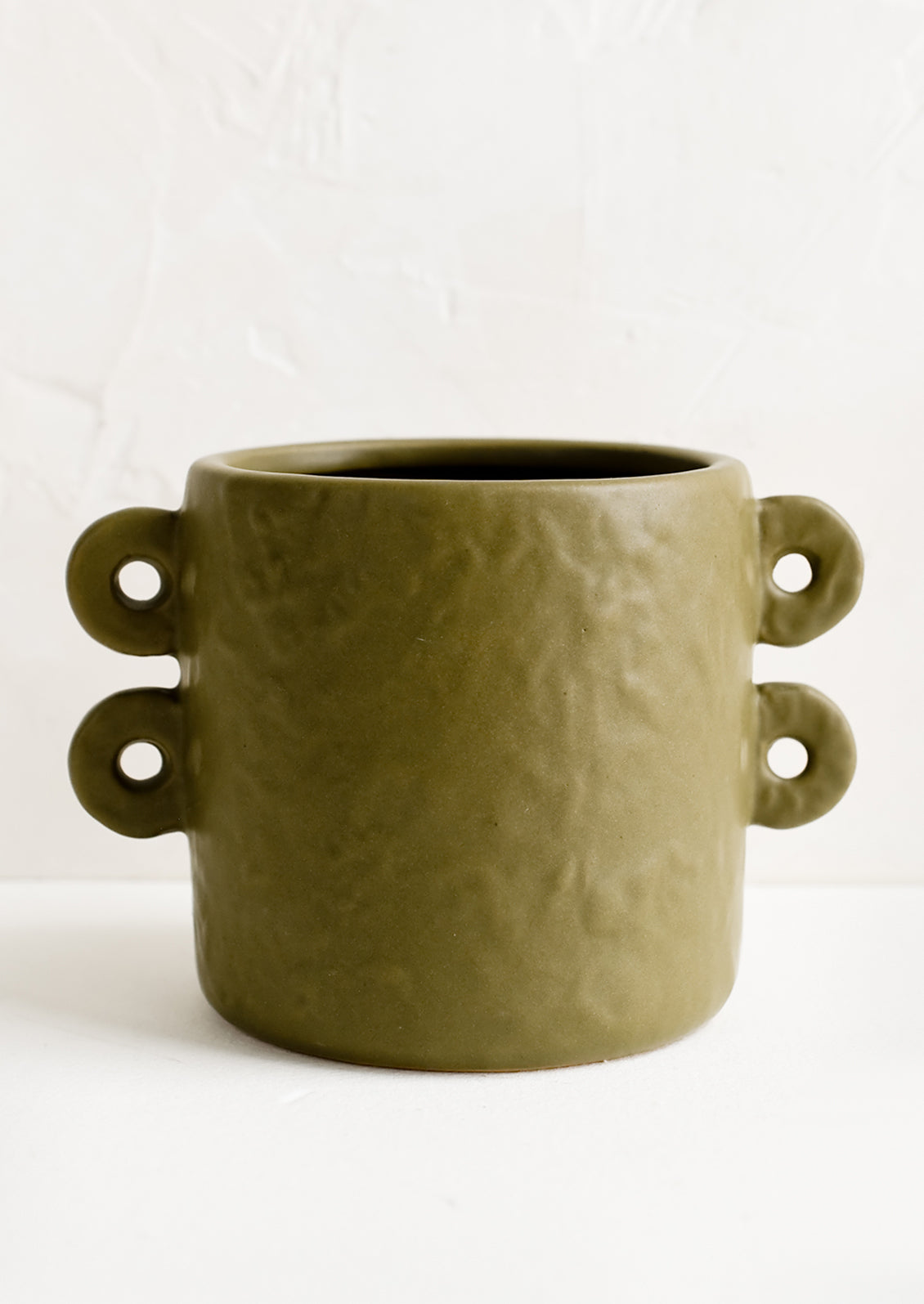 In the perfect shade of army green, this ceramic planter shows off a textured surface for an organic feel. Decorative loop detailing at the side lends a sculptural touch.