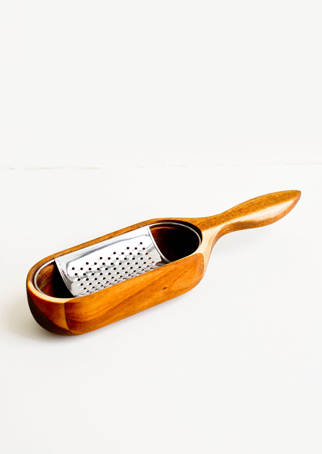 Say goodbye to awkwardly grating over a too-large bowl—this handheld grater conveniently catches grated contents in the attached acacia wood container. The metal grating insert can be reversed and stored serrated-side-down when not in use for safe, non-scratchy storage.