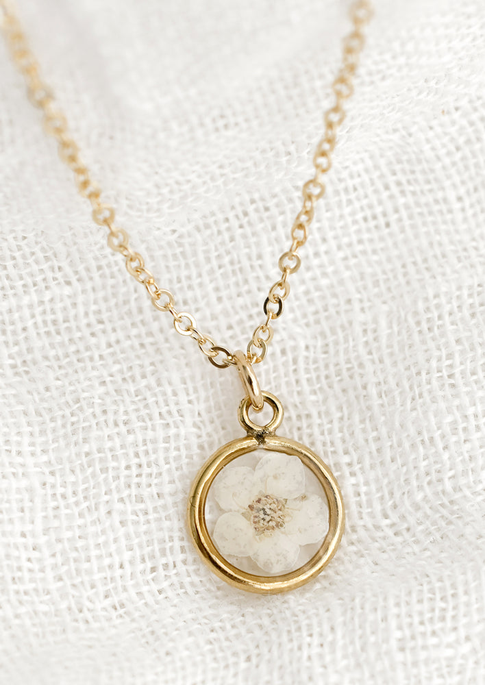 Framed in gold fill, the tiniest of (real!) flowers is framed in crystal clear resin on this botanical necklace.