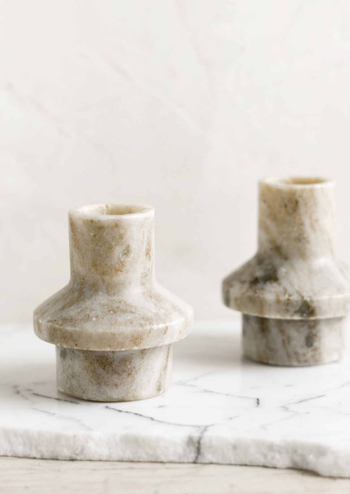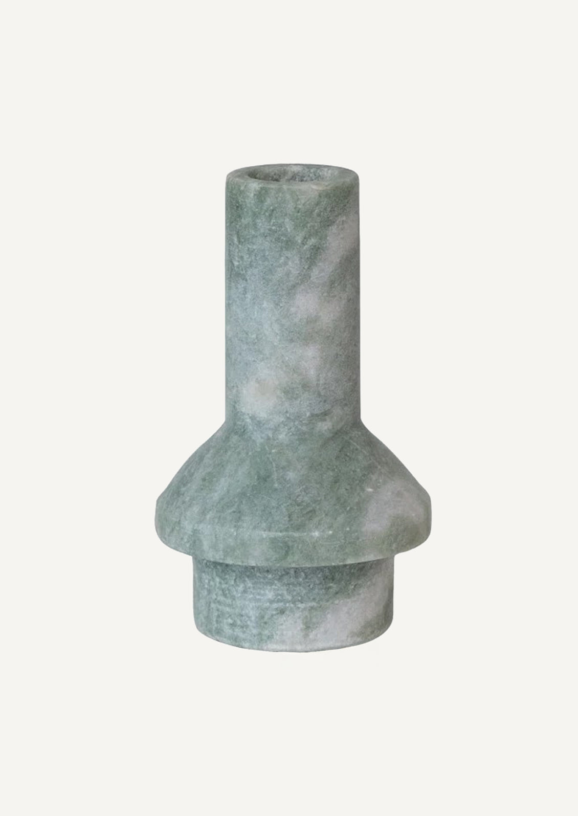 Crafted in solid marble, each of these sculptural taper holders shows off a gorgeous melange of green marble. Sold individually, each one will vary in color and appearance — review photos to get a feel for potential variations.