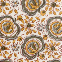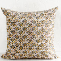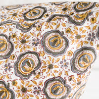 A flowering fan pattern lends subdued whimsy to this block printed pillow, printed in steel blue, goldenrod and red wine hues atop a white background. Each of our pillows is beautifully hand sewn in our Brooklyn, New York studio, and is right at home on the bed or couch.