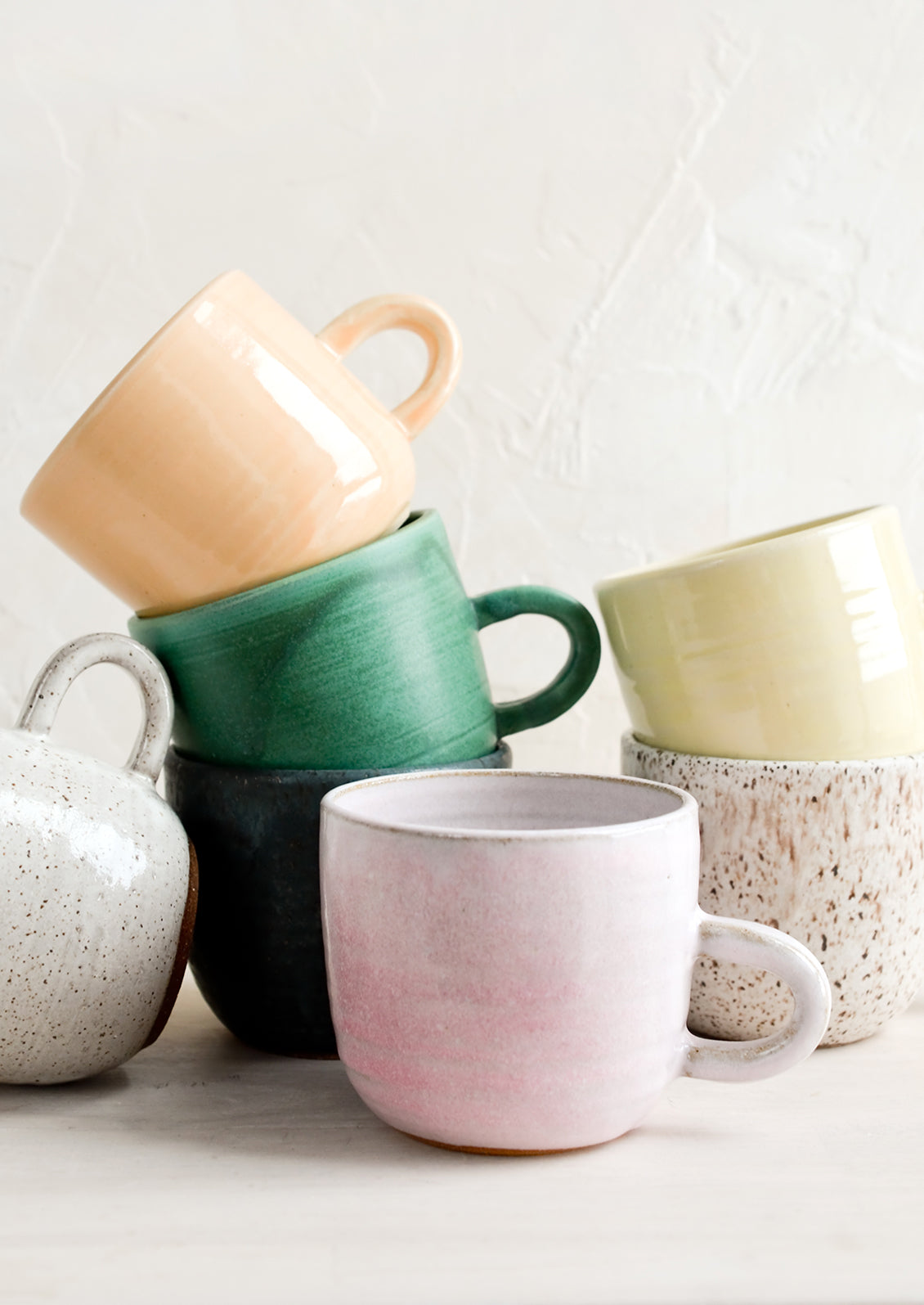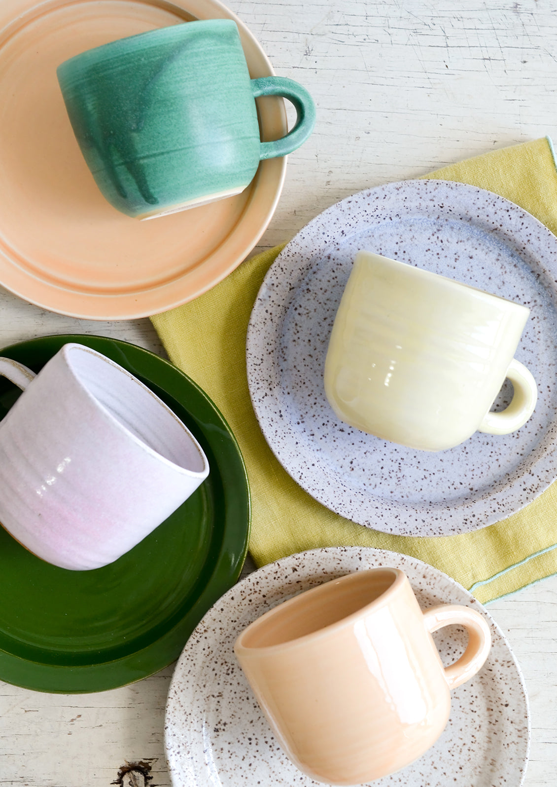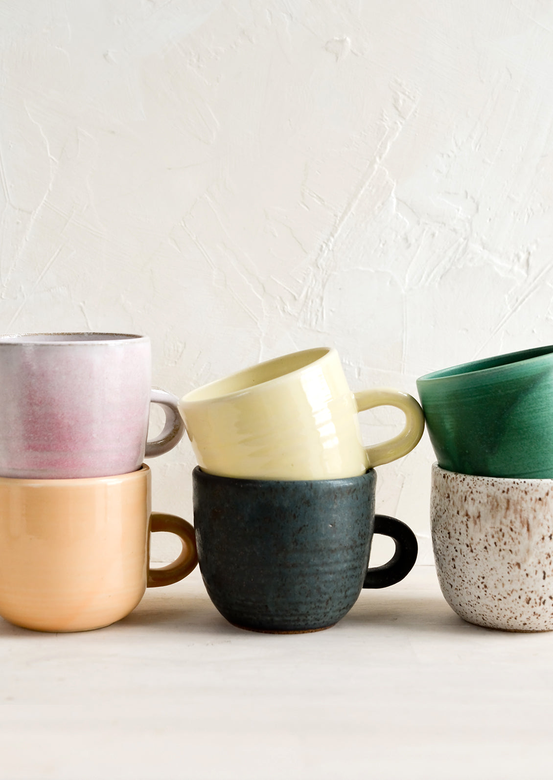 Using hand-mixed glazes, these mugs form a beautifully eclectic assortment, ranging from glossy to textured to matte. A timeless form with soft curves becomes a modern classic. From ANK.