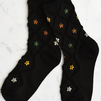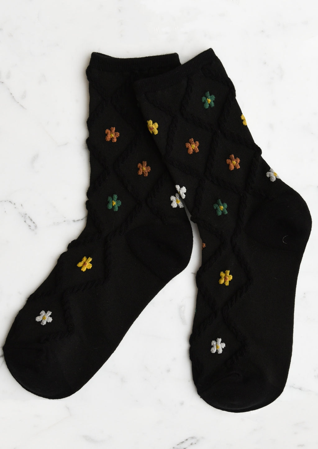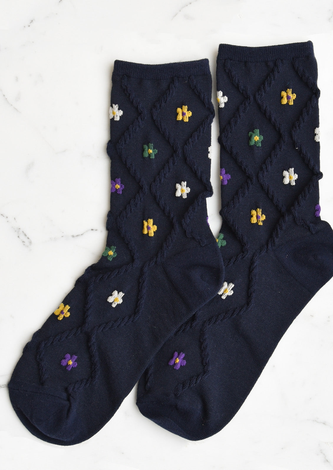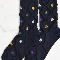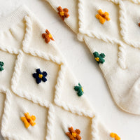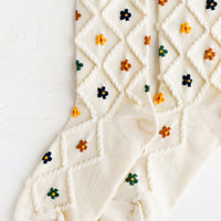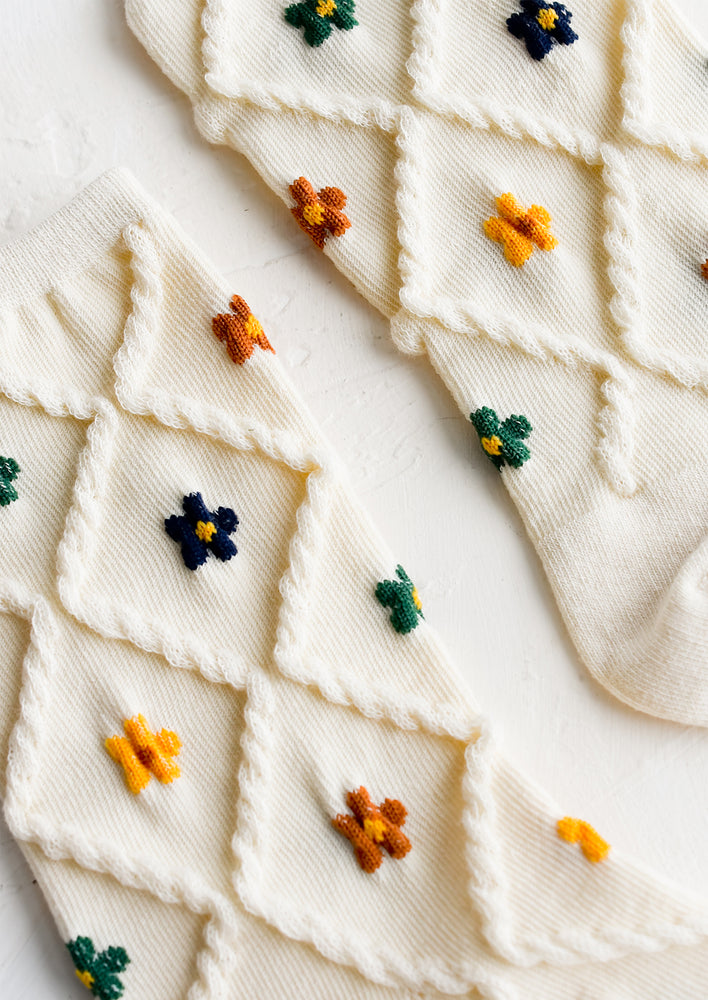 An argyle-inspired texture mingles with tiny flowers in muted hues on these cream-colored cotton socks.