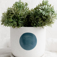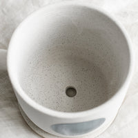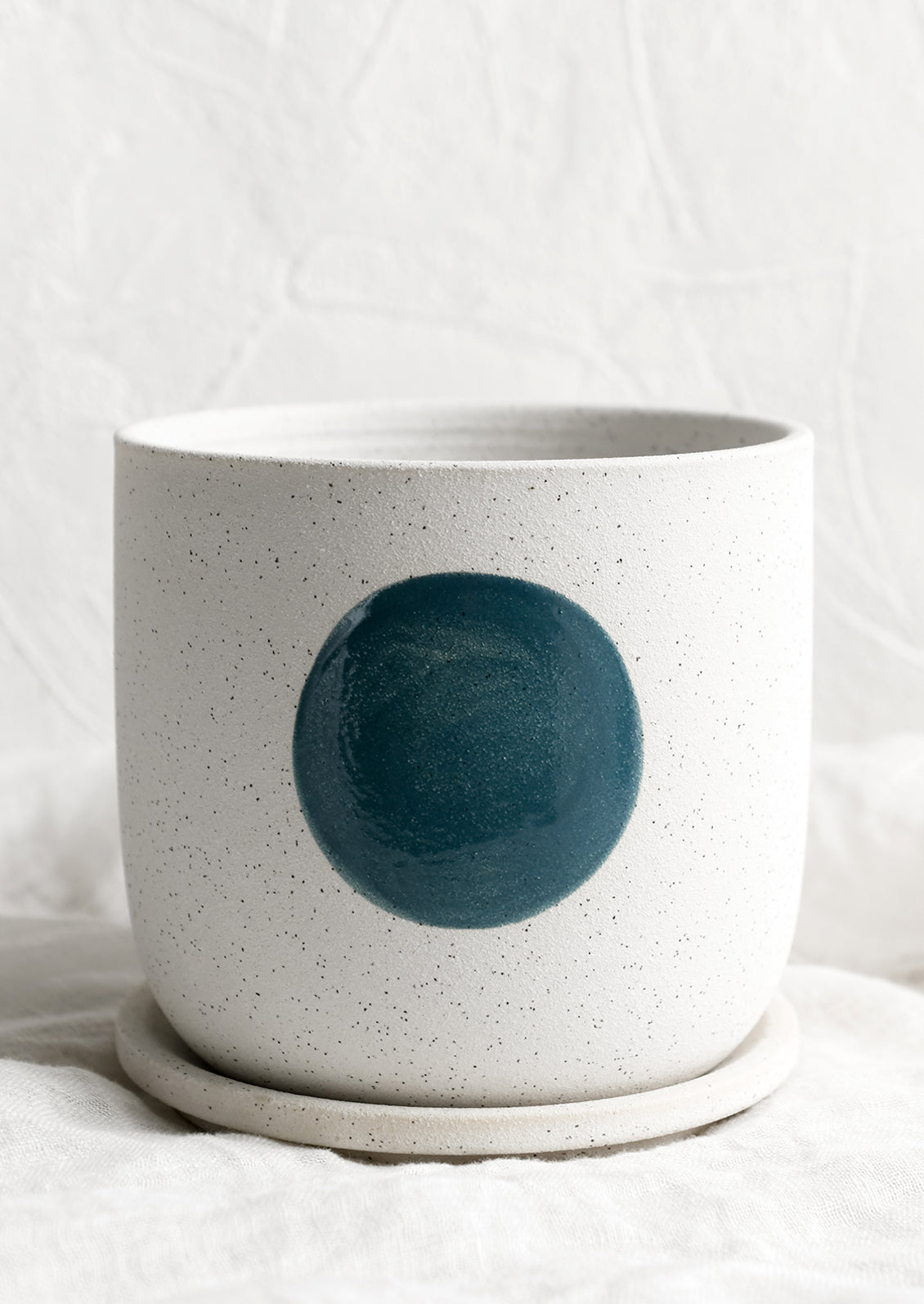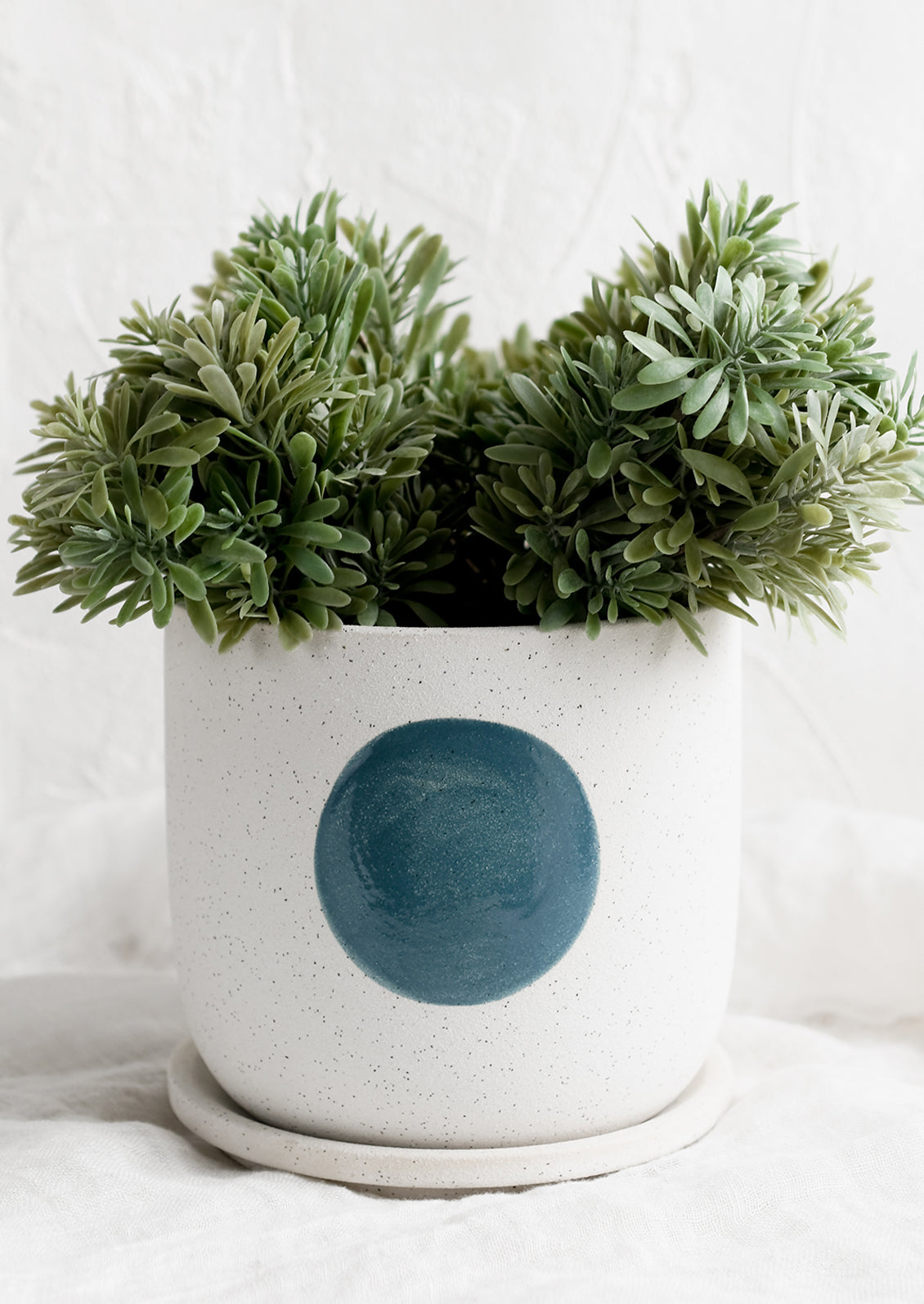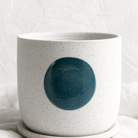 Dot marks the spot? A painted blue spot makes for a minimalist moment on this softly speckled, white ceramic planter — complete with a drainage hole and included saucer.