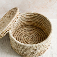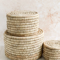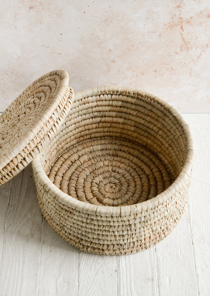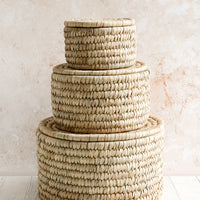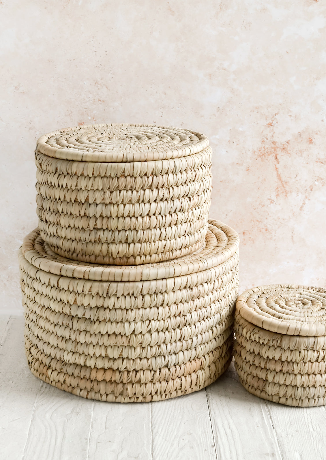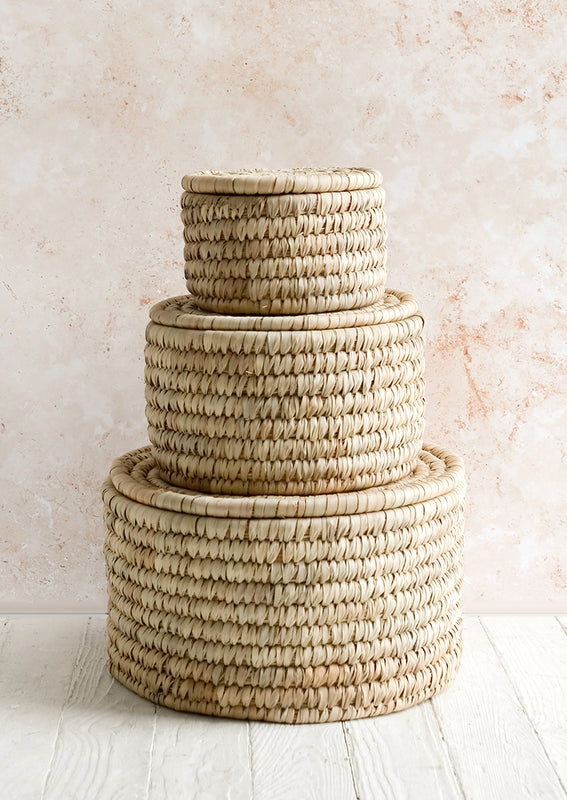 This au naturel basket is hand woven from dried palm leaves, left in their natural state—available in three nesting sizes to ensure a perfect fit for any use.
