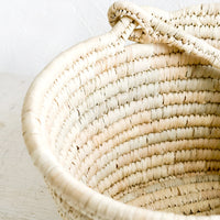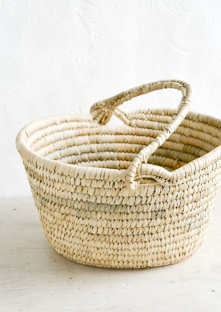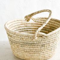 A swing-attached top handle makes for versatility and space-saving storage (and also good looks) on this natural straw basket, perfect in the bathroom, laundry room, or entryway.