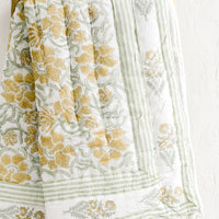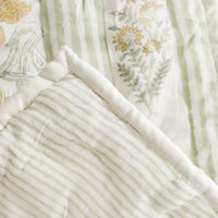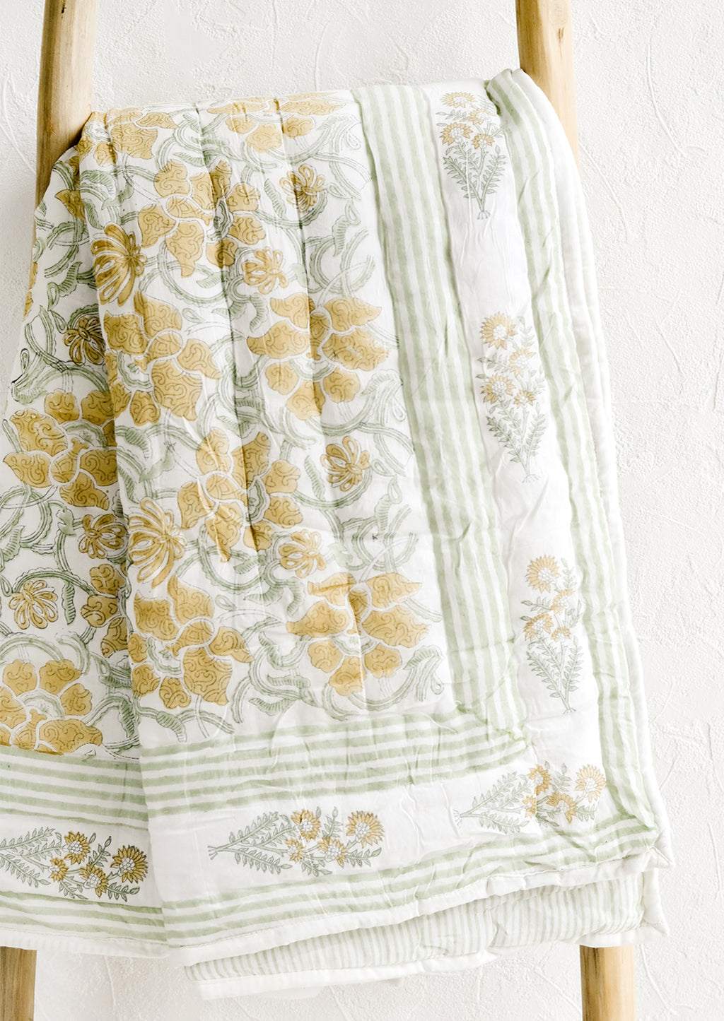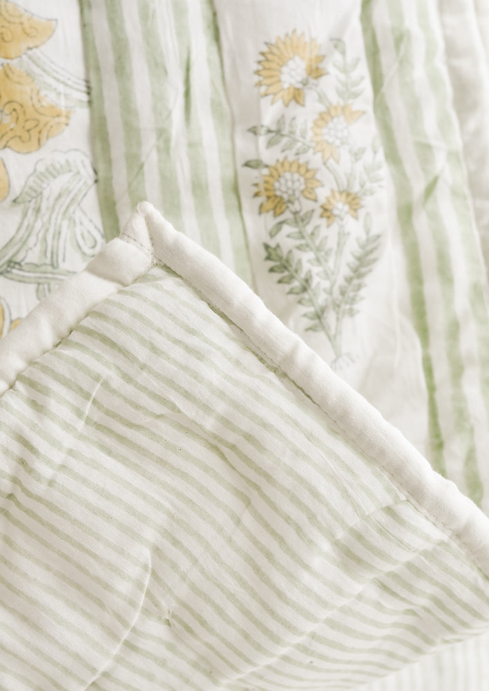 In a gorgeous palette of pale sage green and dusty yellow, this pastel-hued quilt shows off a block printed botanical print (with a contrasting stripe on the other side). An insulated fill provides cozy warmth.