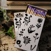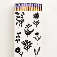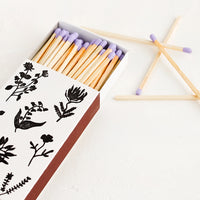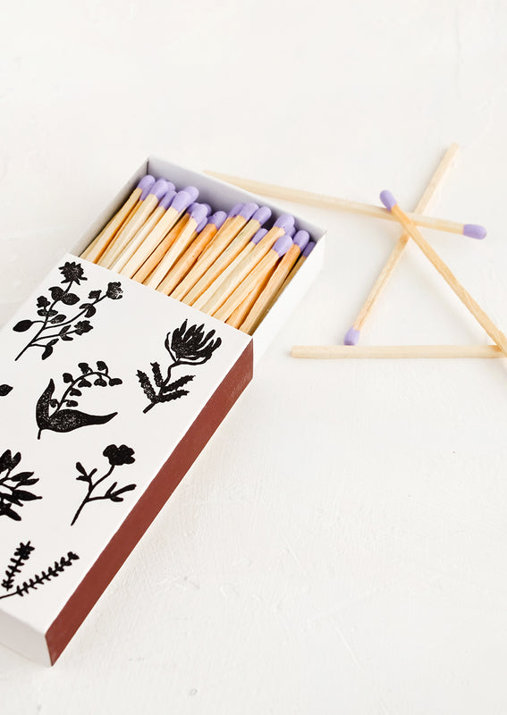 Silhouetted botanical species decorate this foil-pressed matchbox, featuring unique patterns on both sides and filled with an abundance of lavender-tipped matches.