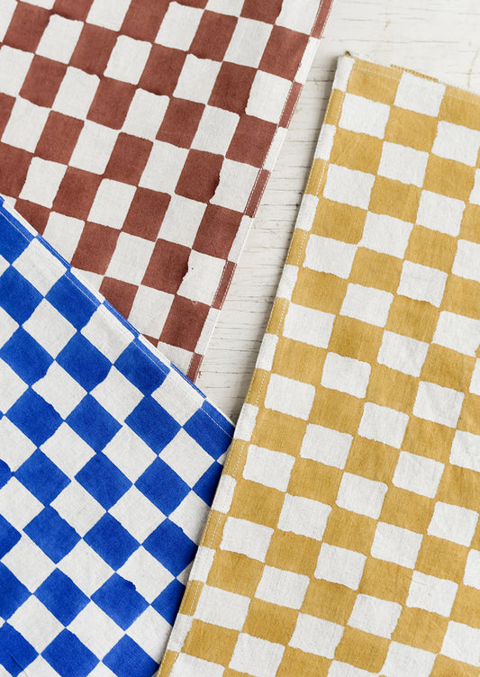 • A linen table runner in cobalt checker print.