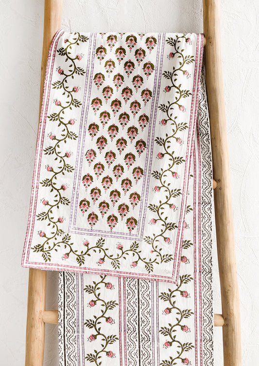 • A block printed white table runner with pink, green and lavender floral print.
