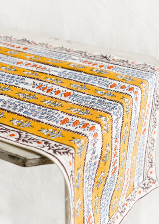 • A stripe floral print table runner in marigold, purple and blue.