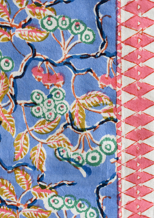 • A block printed table runner in blue and pink floral.