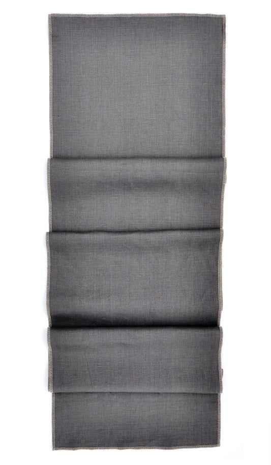 • Linen blend table runners in beige and charcoal.