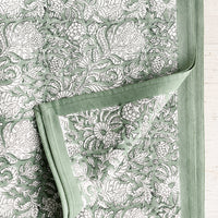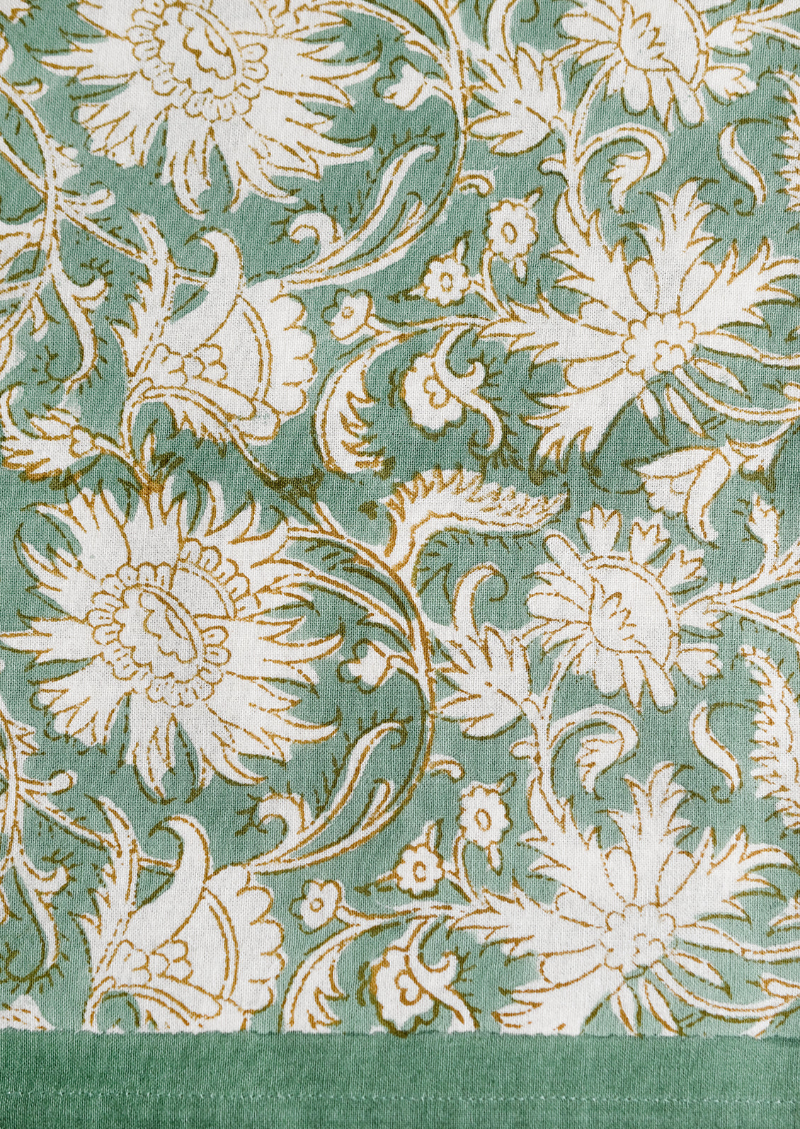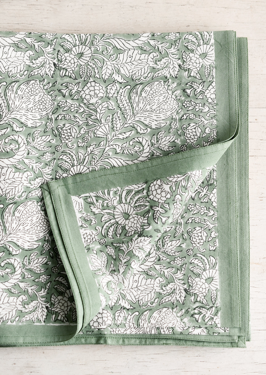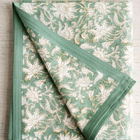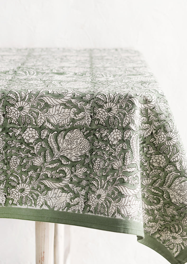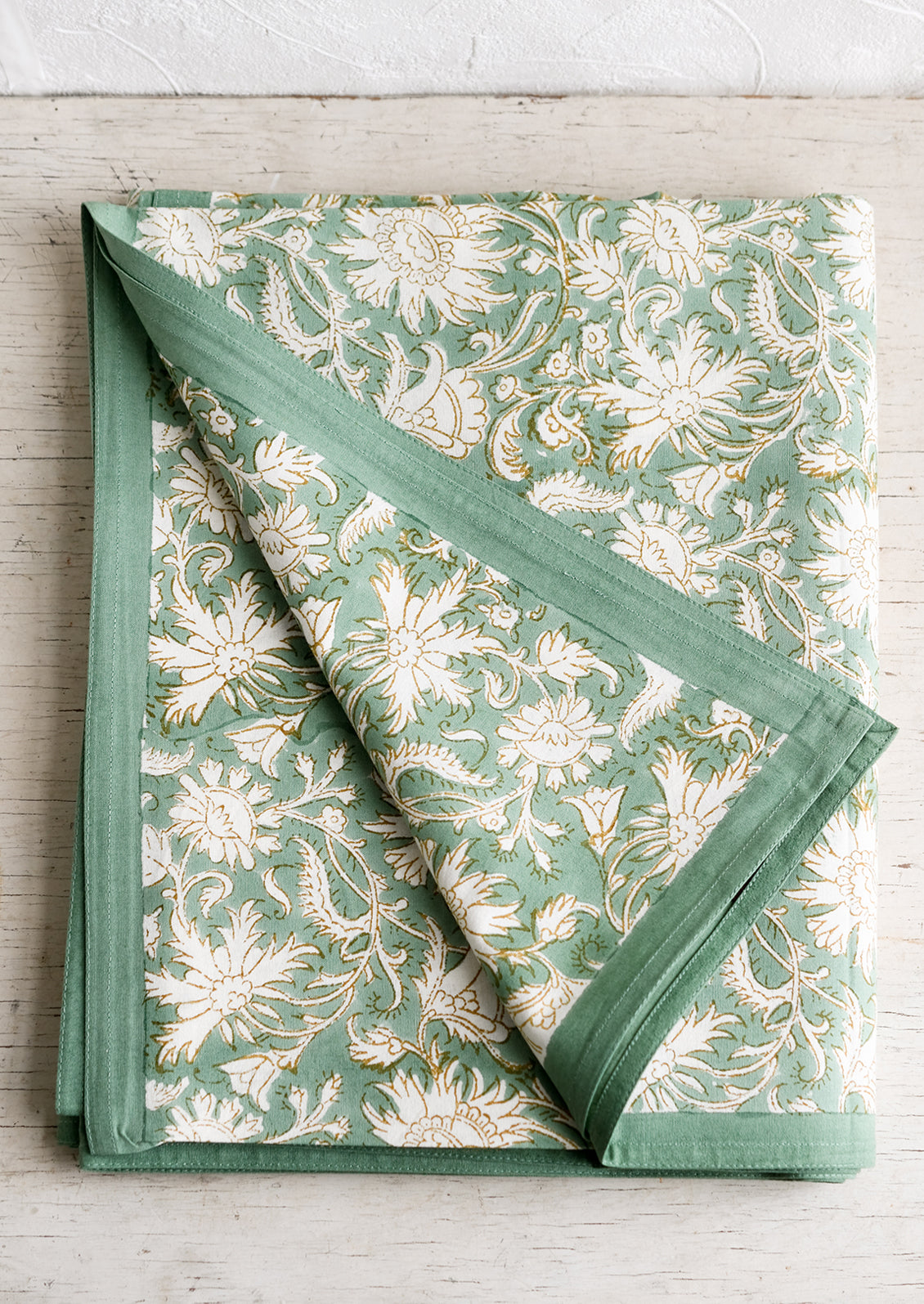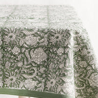 Block printed by hand in a classic floral motif, this timeless tablecloth dresses up the table just enough for casual meals and special occasions alike.