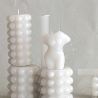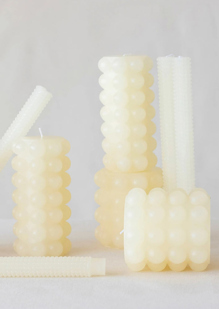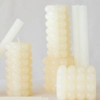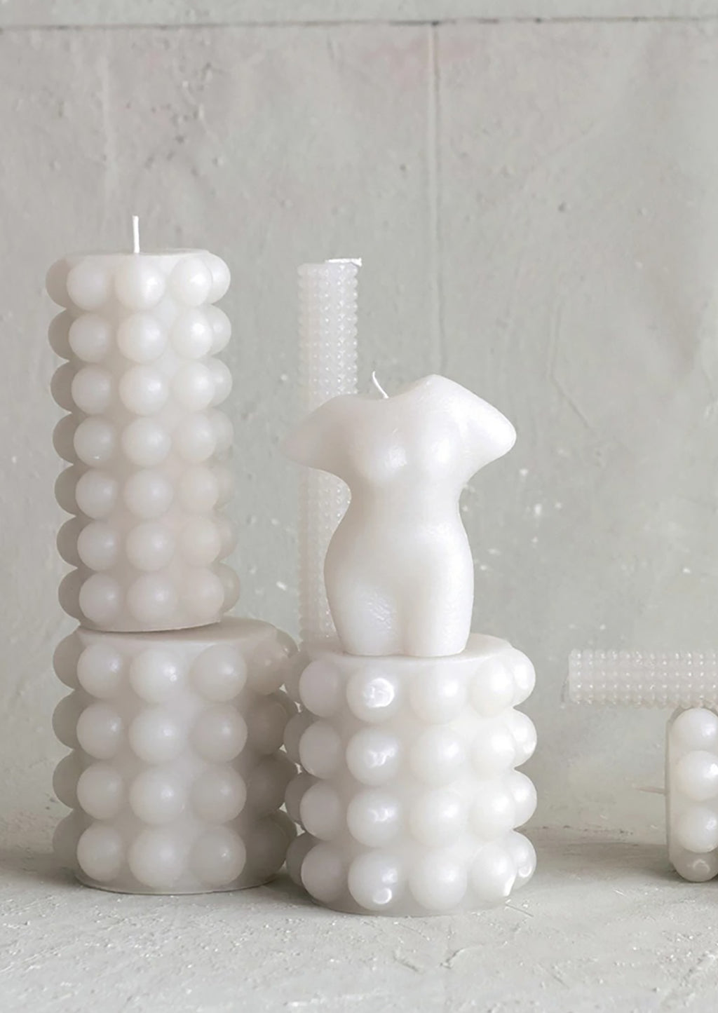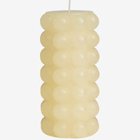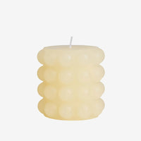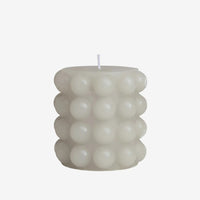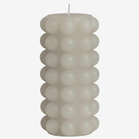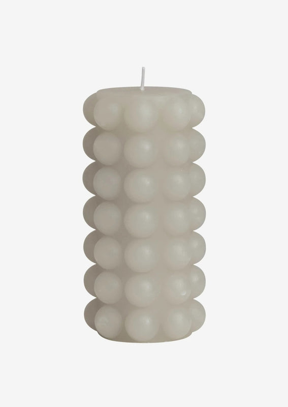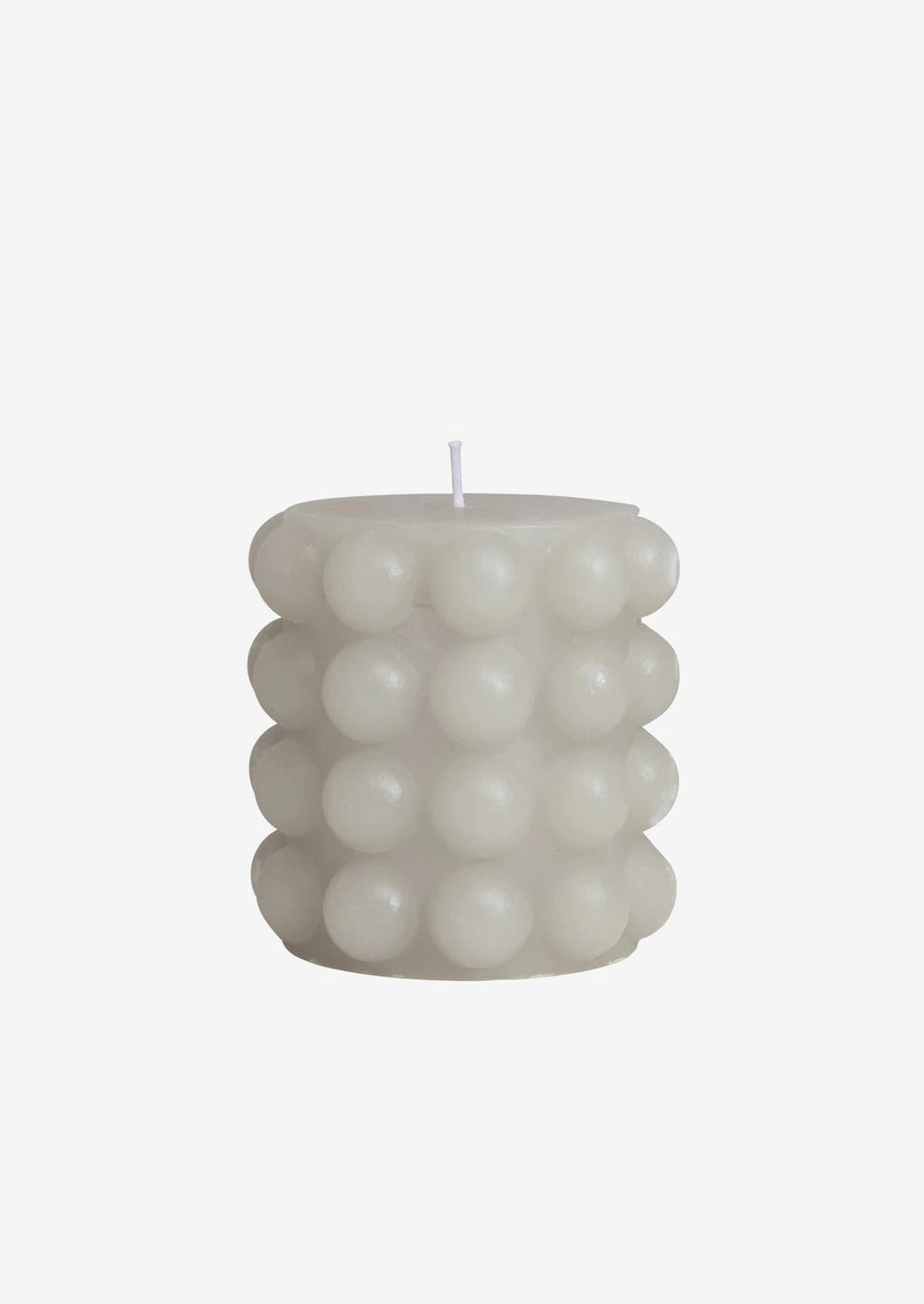 Used purely as decoration as a styling piece on a shelf or console, or actually burned for softly-lit ambiance, this chunky pillar candle shows off a hobnail texture.